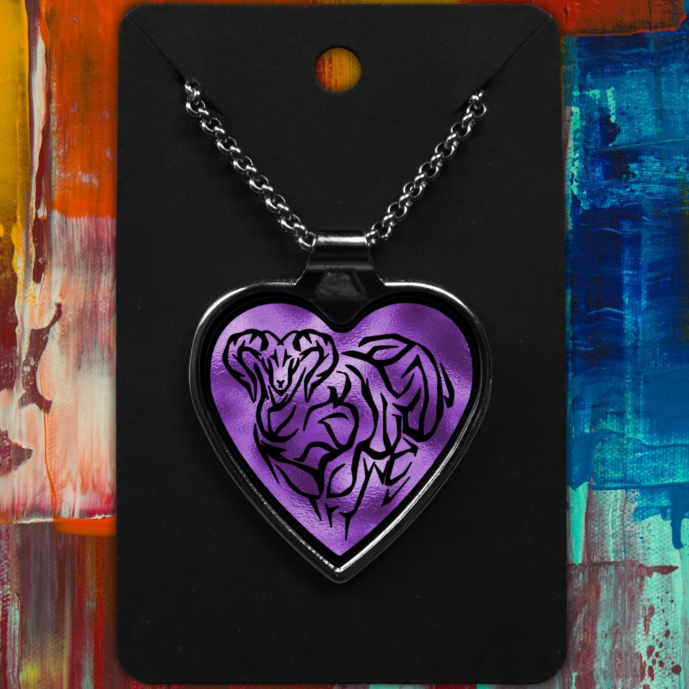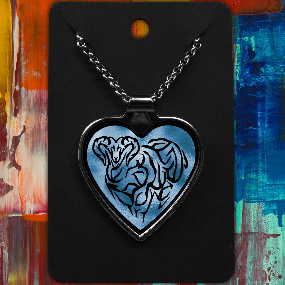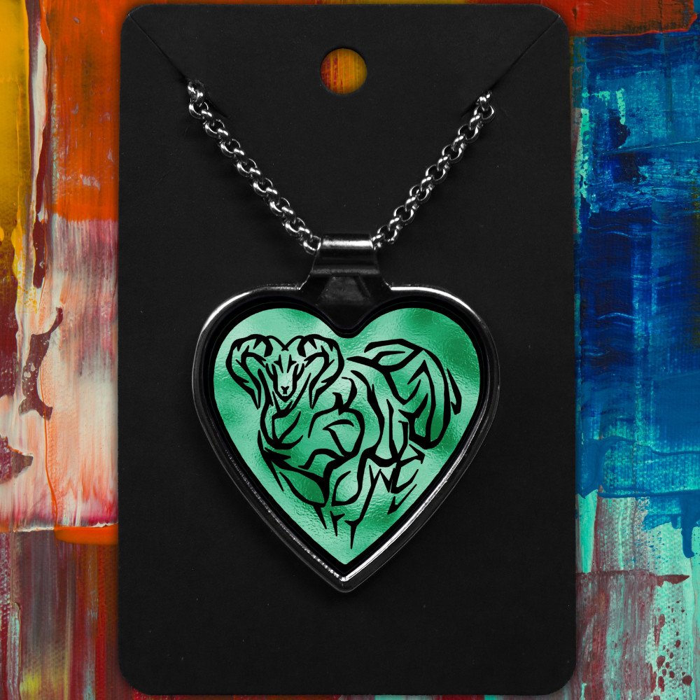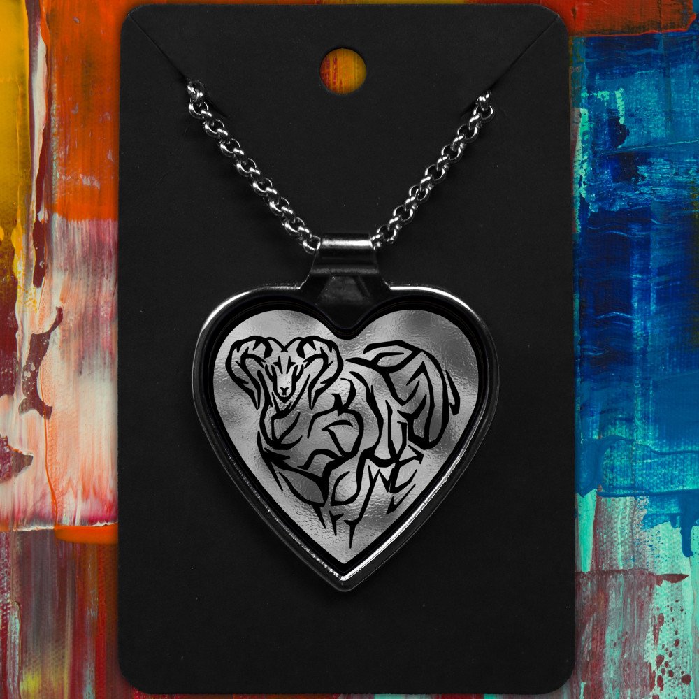 Aries metal heart-shaped necklace with a Tribal Design on a shimmering background.