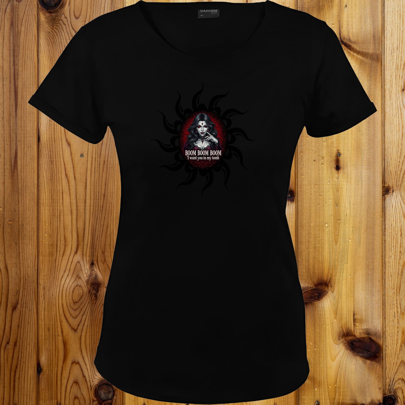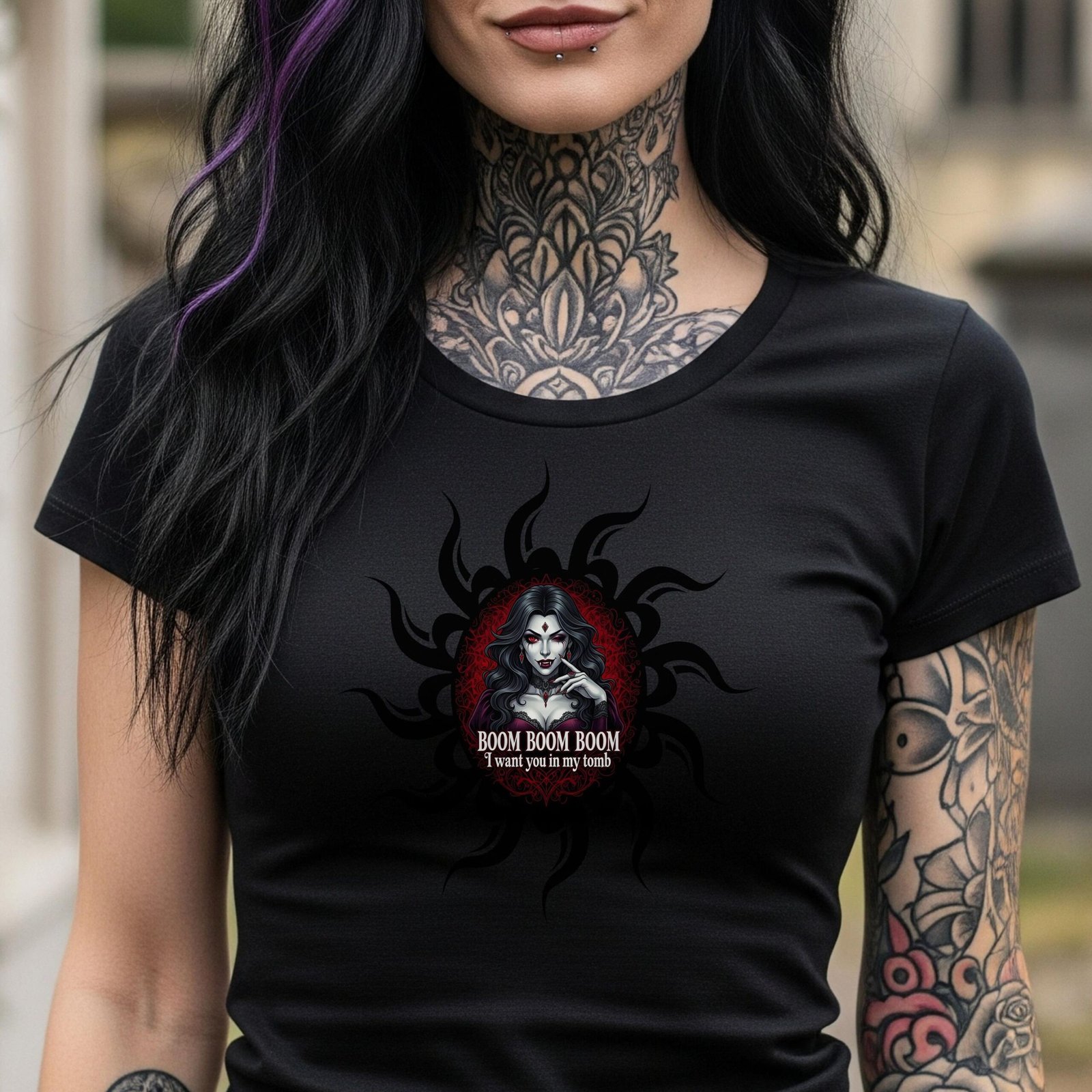 Dare to be delightfully daring with our “Boom Boom Boom, I Want You in My Tomb” T-shirt! This quirky gothic black tee is specially designed in a fitted feminine cut to flatter your figure while showcasing your unique dark aesthetic. At its heart, a captivating female vampire beckons with a playful wink and a seductive gaze, her long dark hair framed by an eerie yet alluring sunburst design in shades of black and deep red. Her pale skin and crimson lips create a striking contrast, making her an irresistible focal point.