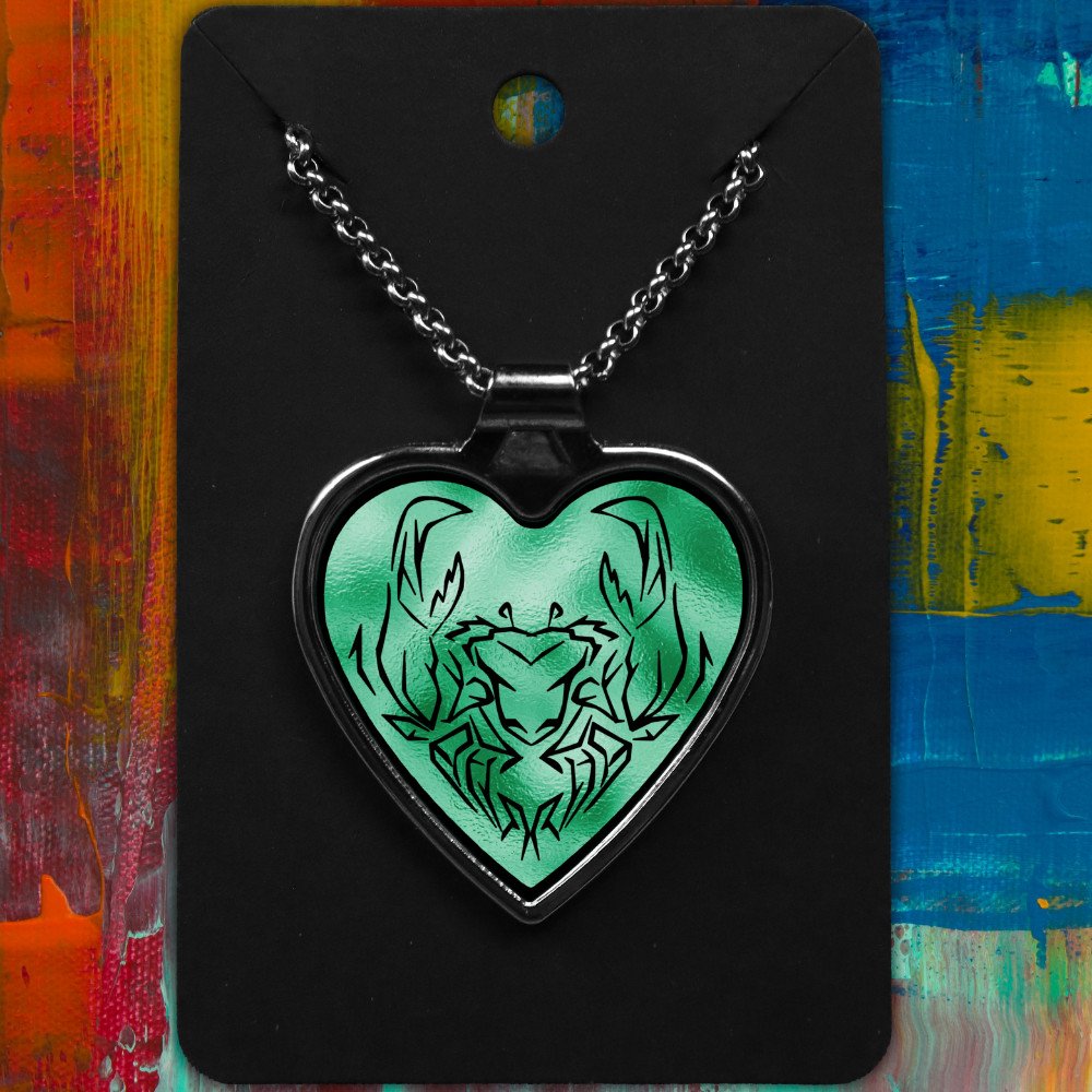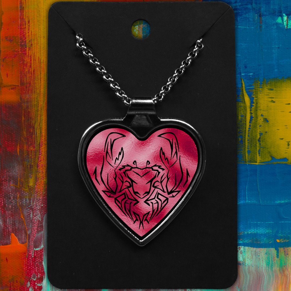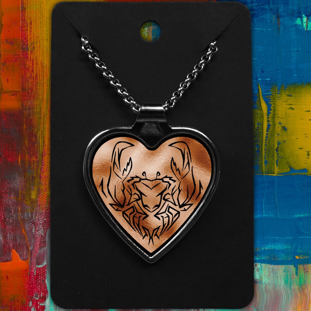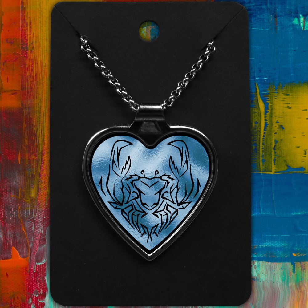 Cancer metal heart-shaped necklace with a Tribal Design on a shimmering background.