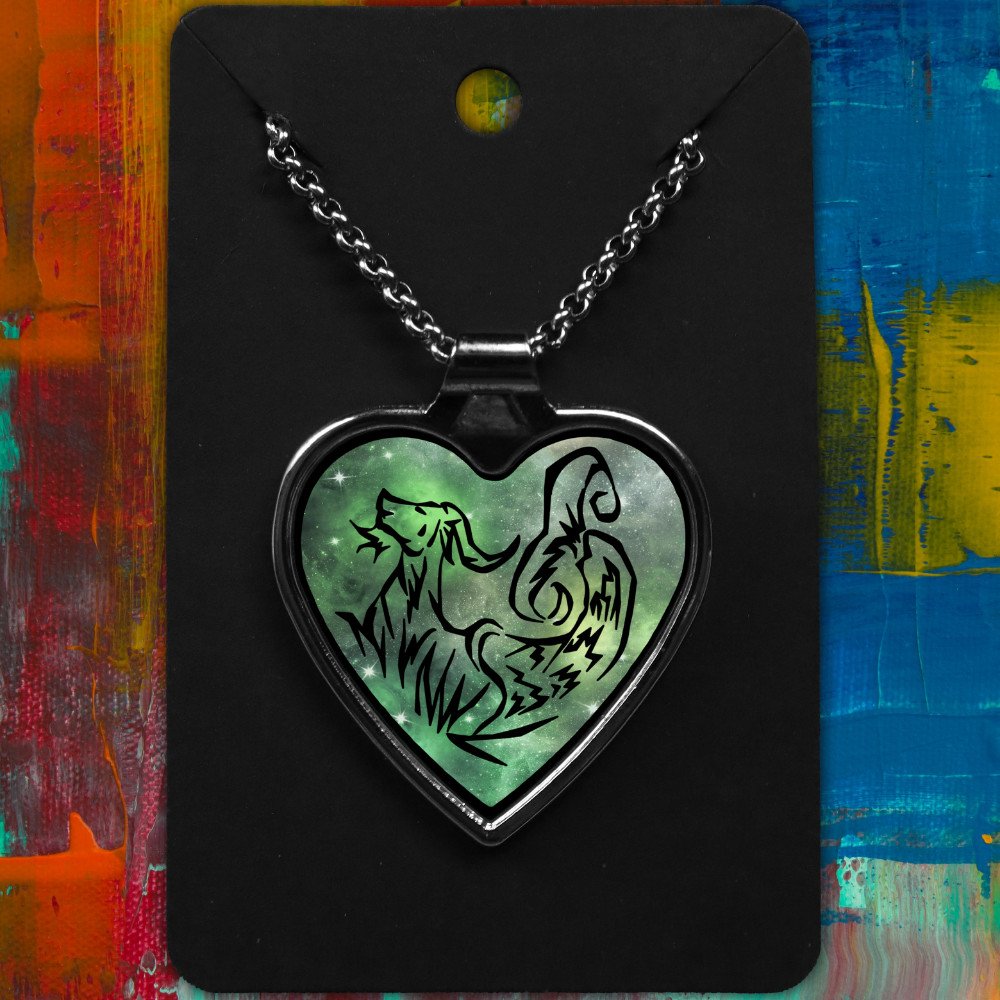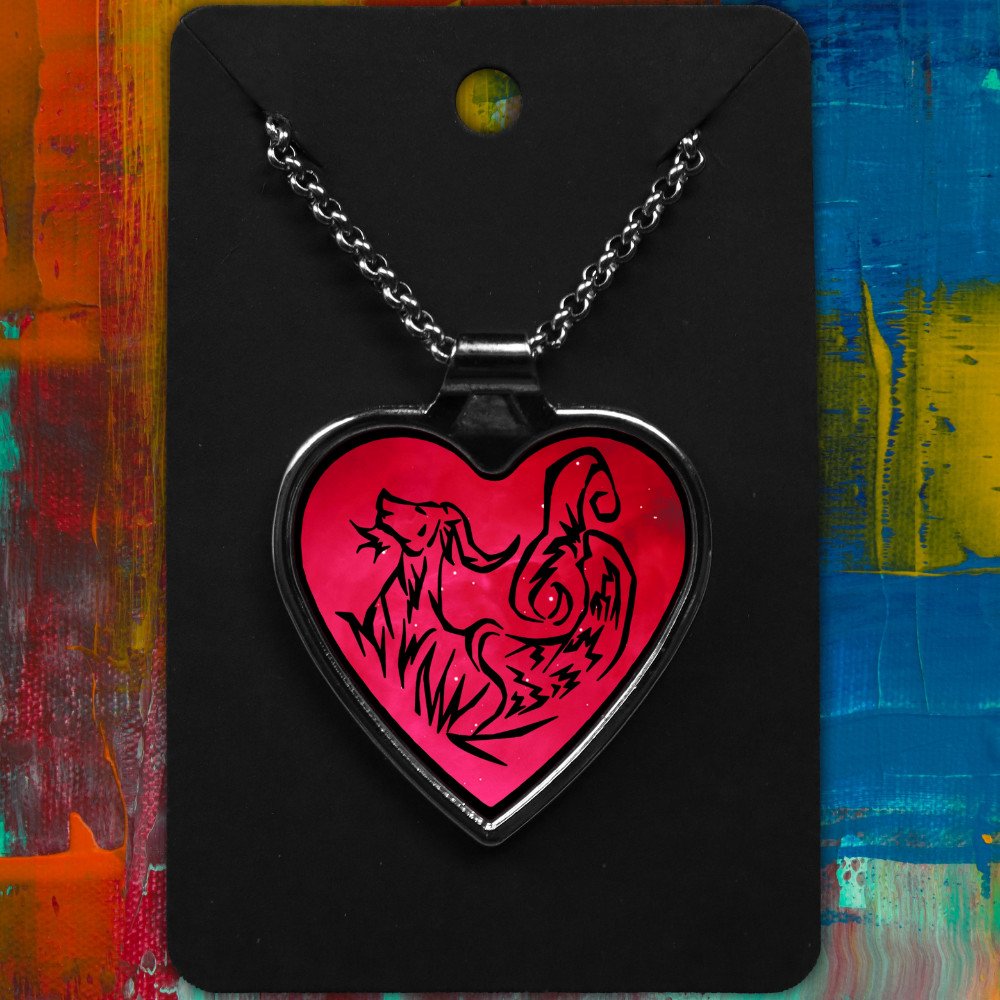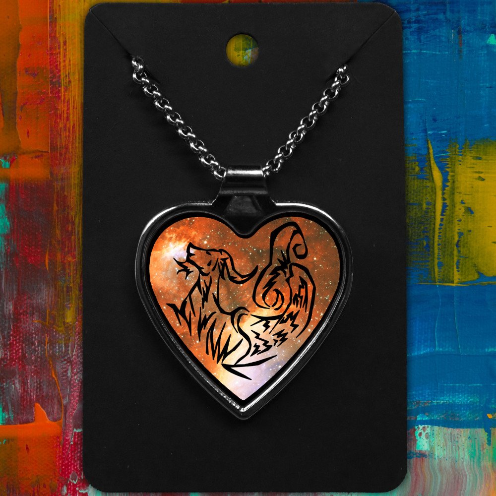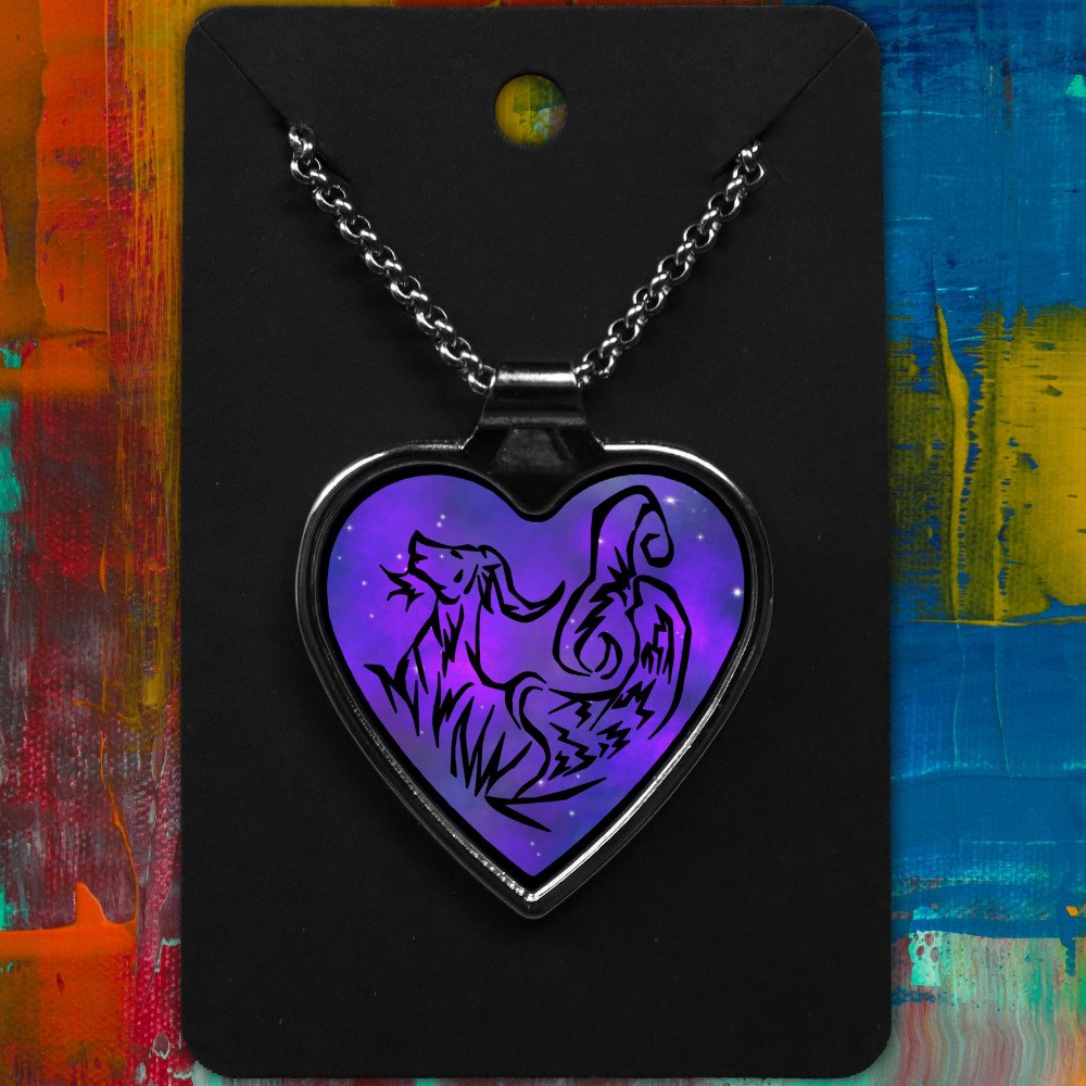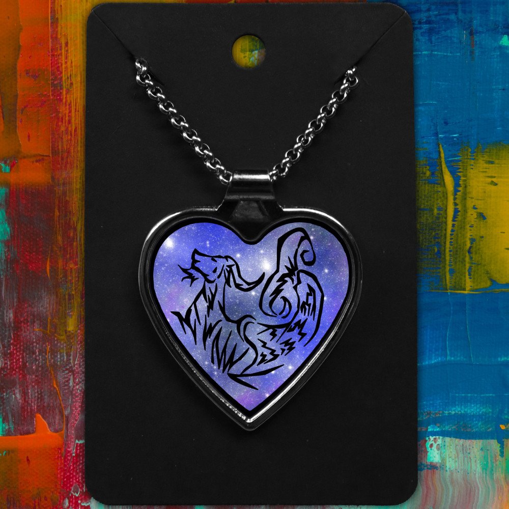 Capricorn metal heart-shaped necklace with a Tribal Design on a starry background.
