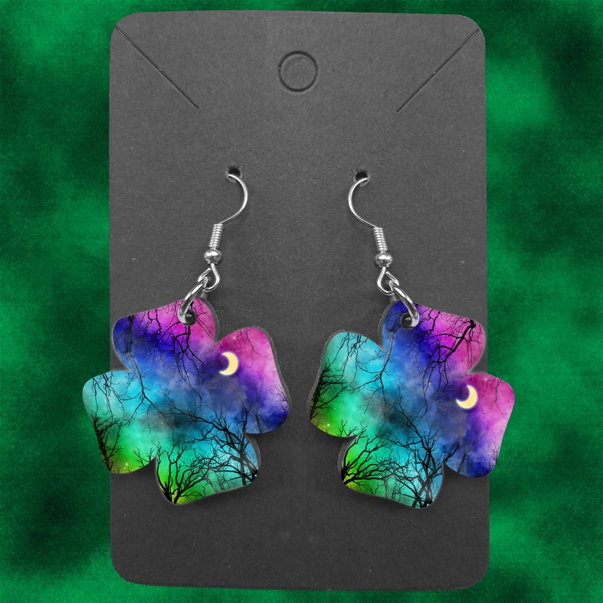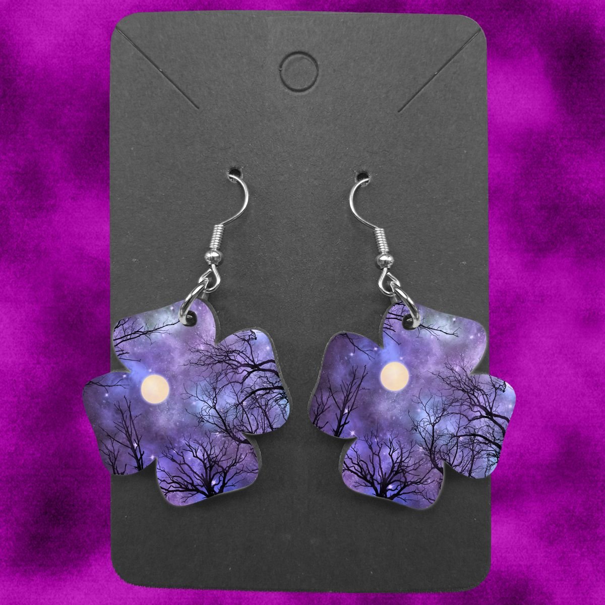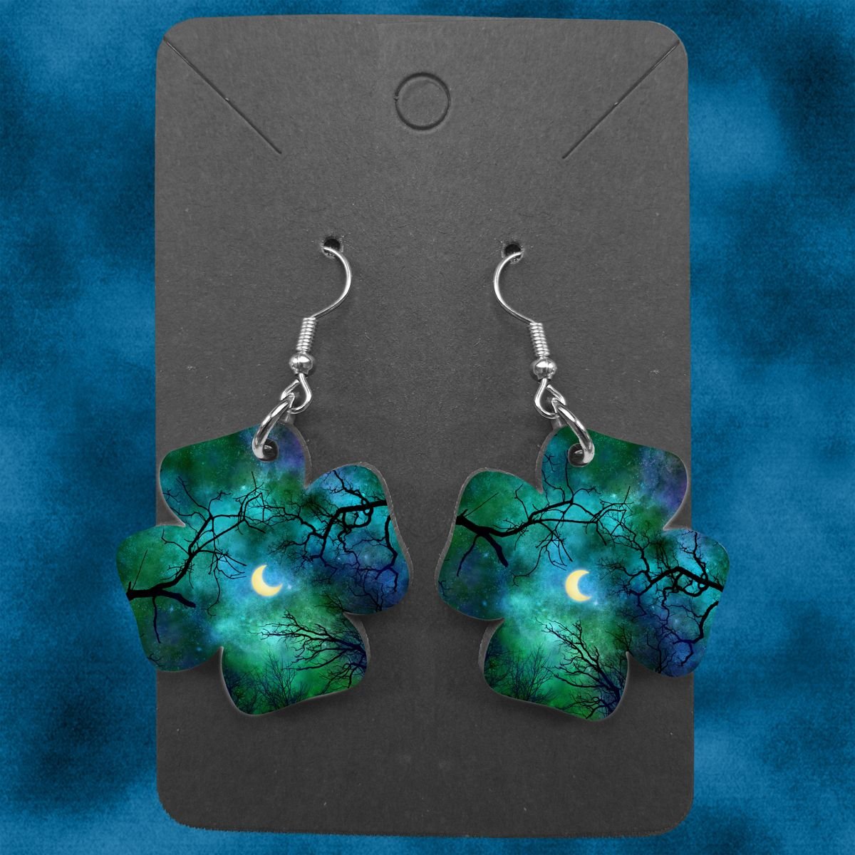 Wooden Sublimated ear ring set with a mystical Luna Forest design printed on both sides of each ear ring