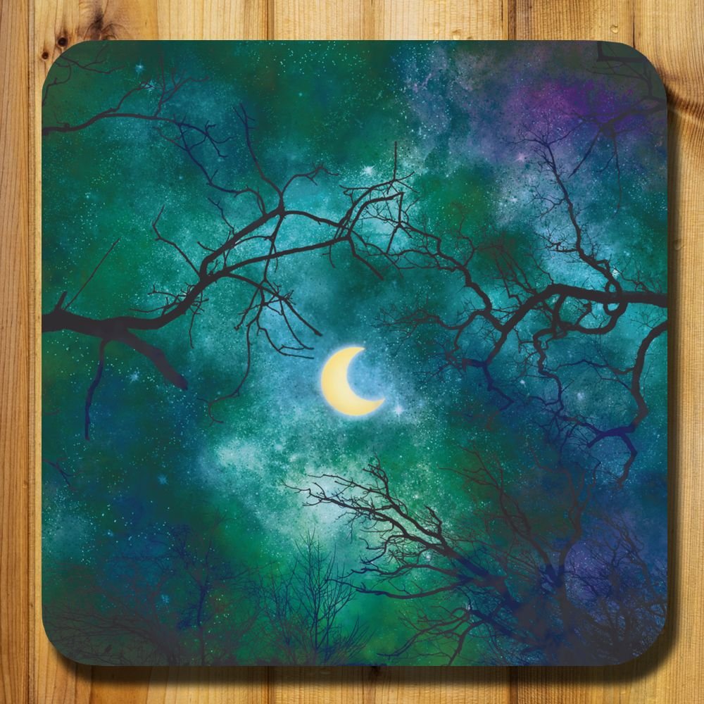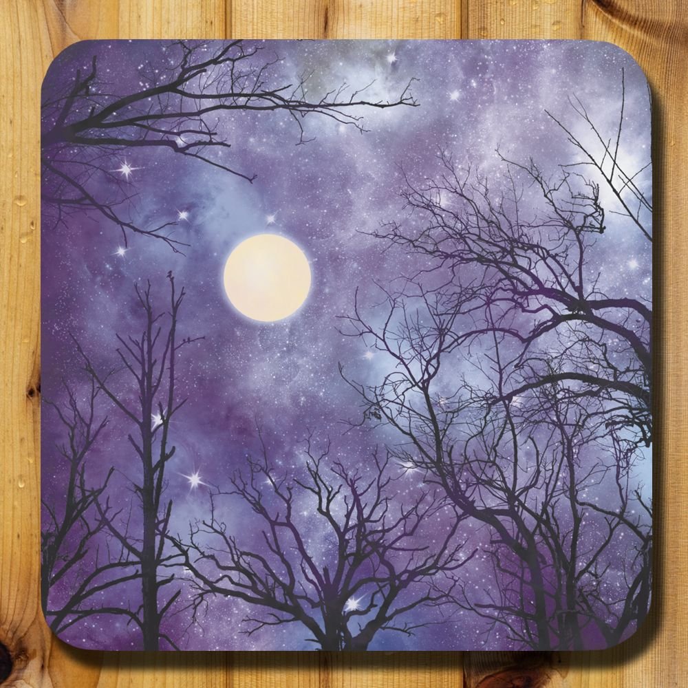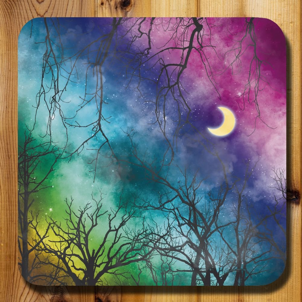 Each coaster features a mesmerizing design of an eerie forest silhouette set against a vibrant, celestial background with a bright moon. The blend of rich, colorful nebulae and the stark, twisted trees creates a powerful and enchanting atmosphere, making each coaster a unique piece of art for your table.