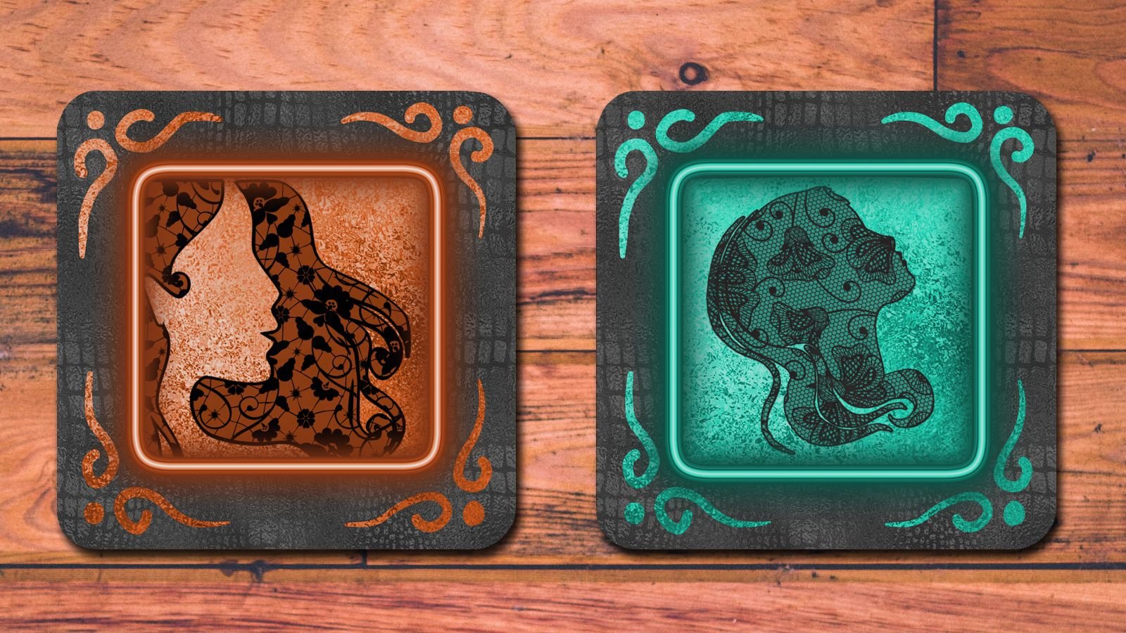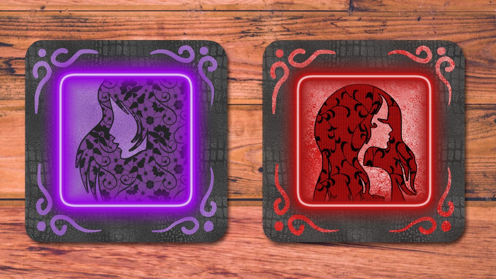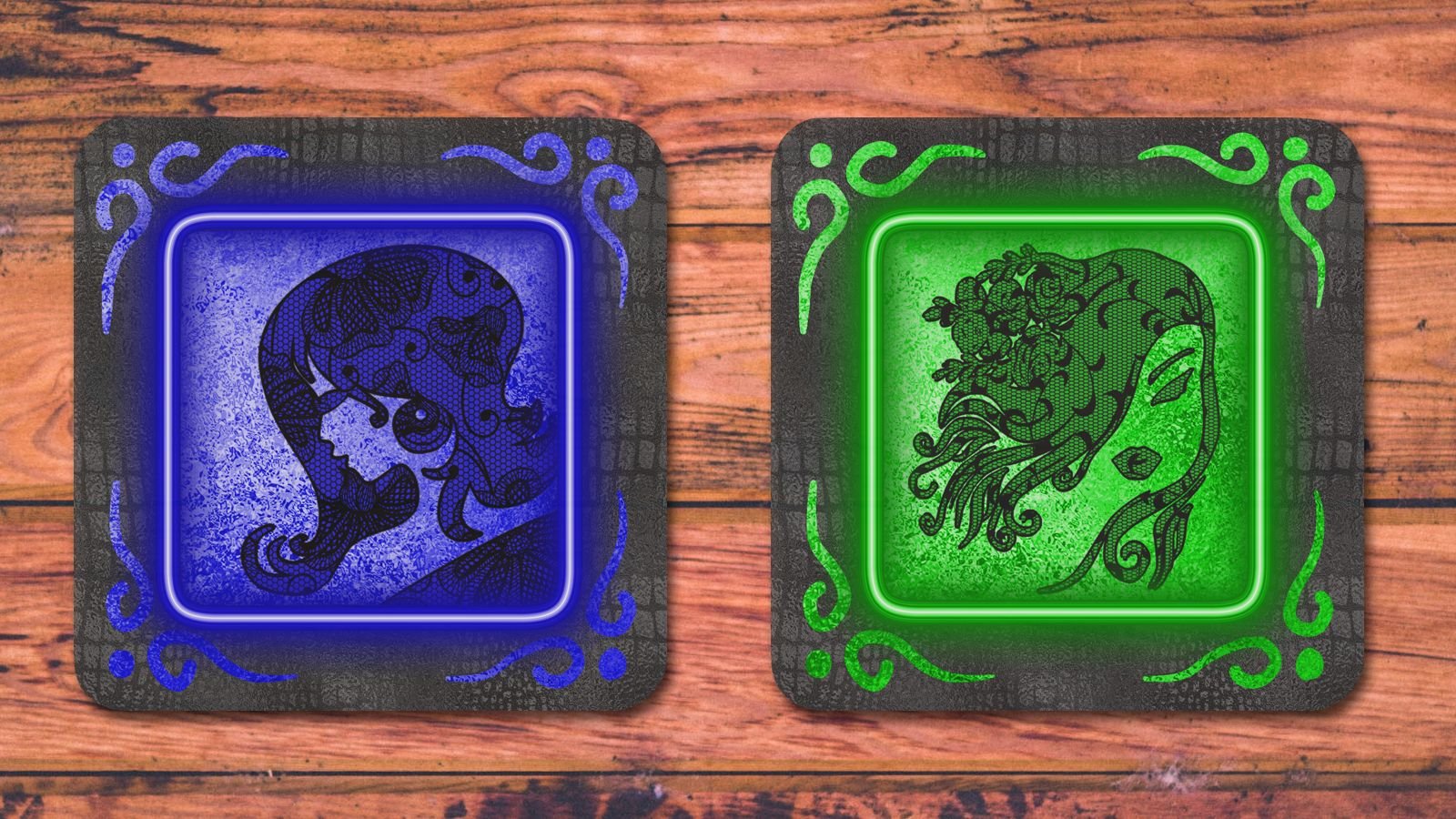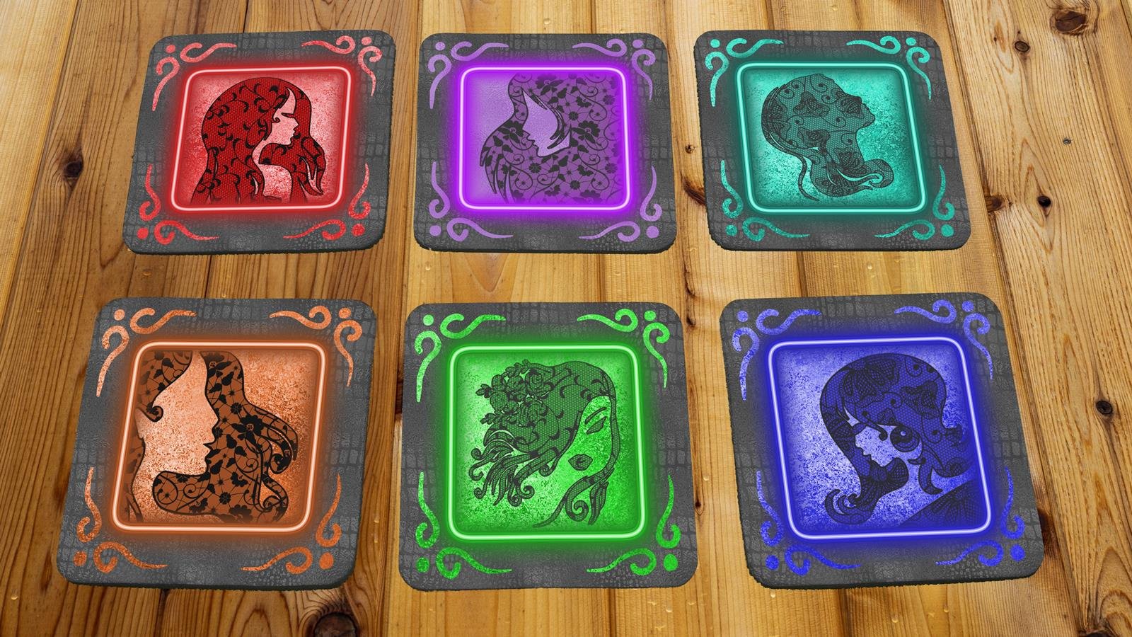 Each of the six coasters features a unique, intricately detailed woman’s head silhouette filled with delicate black lace patterns on a faded black leather background. The designs are surrounded by a vibrant, neon-style frame in a different color—from deep crimson and electric purple to a serene blue and ethereal green. The illuminated look of the frames, along with the swirling corner details, gives each piece a magical, luma-goth feel that will mesmerize your guests.