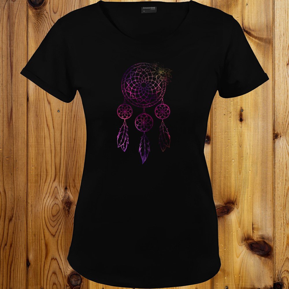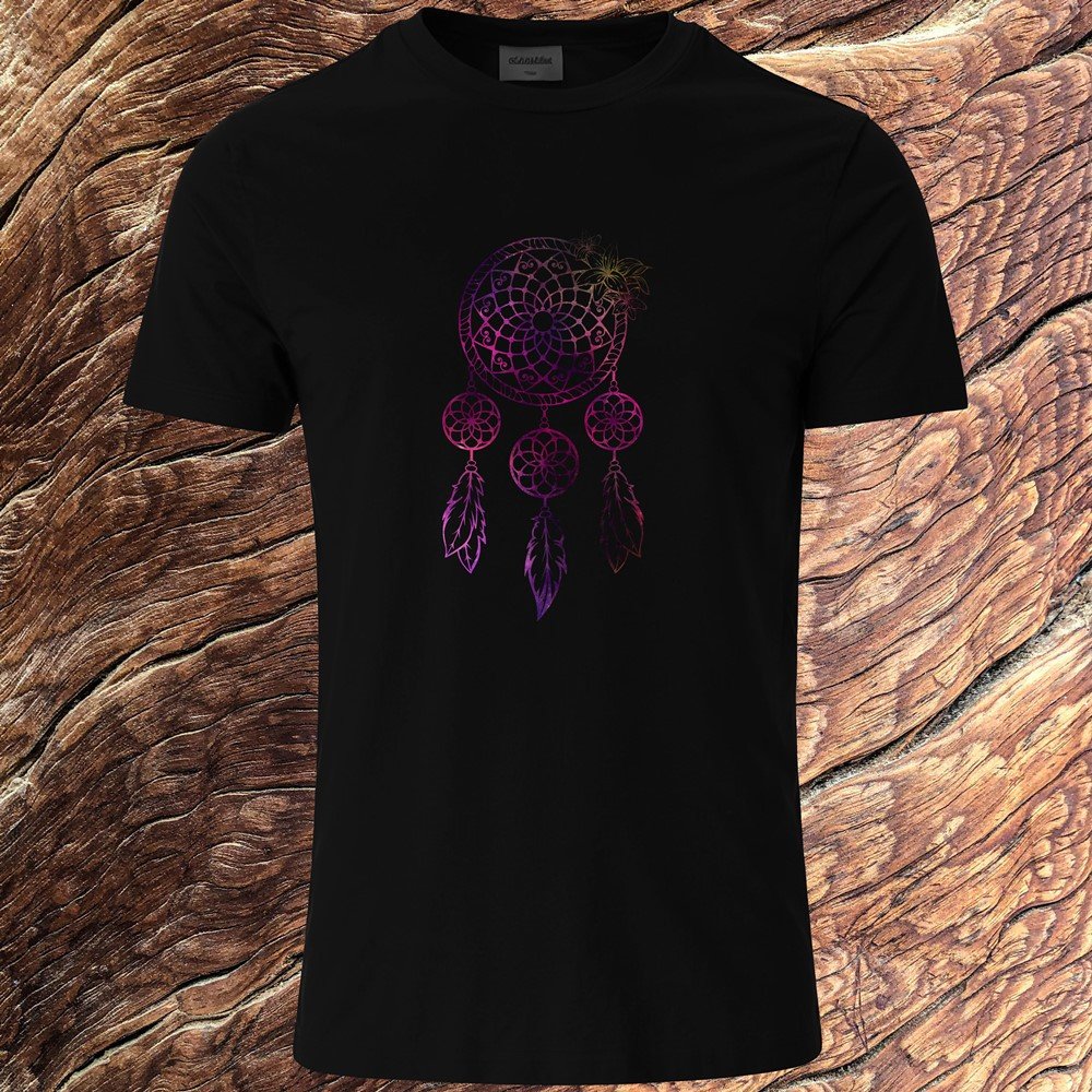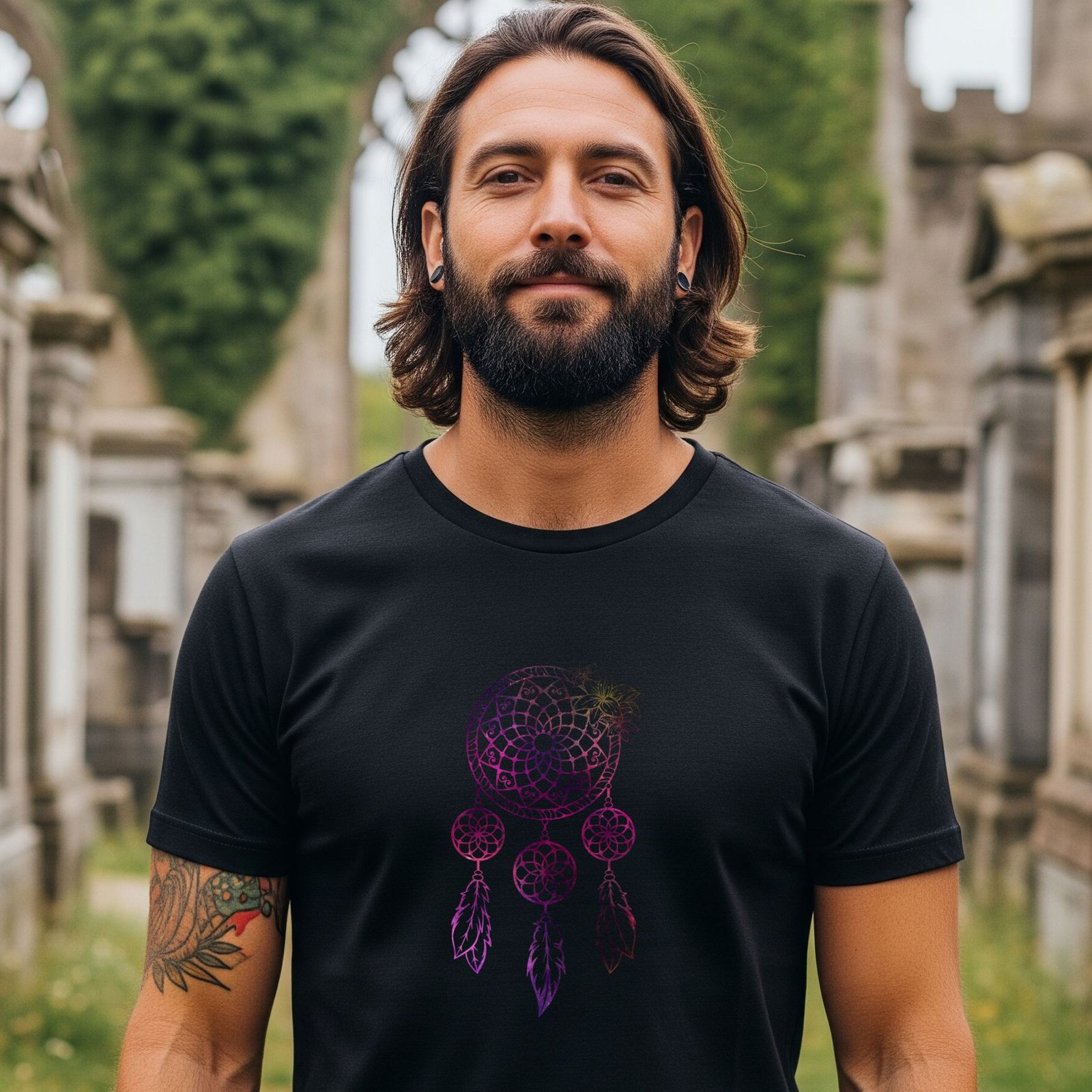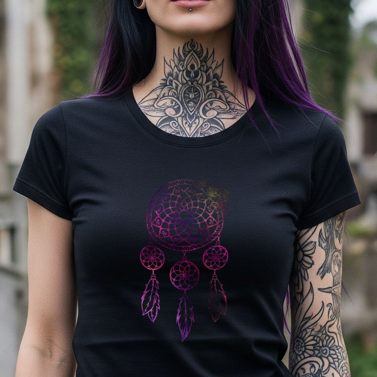 Capture your dreams and ward off bad vibes with our enchanting Dreamcatcher T-shirt! This striking black tee is a modern take on a timeless spiritual symbol, designed for those who find beauty in the mystical and the macabre. The centerpiece is a beautifully detailed dreamcatcher, rendered in a mesmerizing, fading gradient of deep purple to vibrant magenta. The intricate web and delicate hanging feathers are a stylish and subtle nod to its traditional roots, while the sleek colour scheme gives it a uniquely modern and edgy feel.