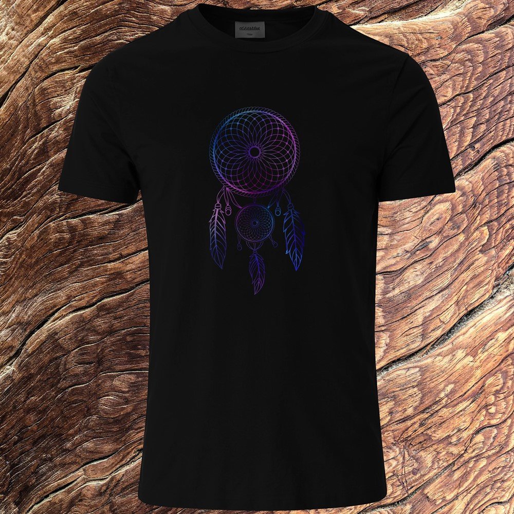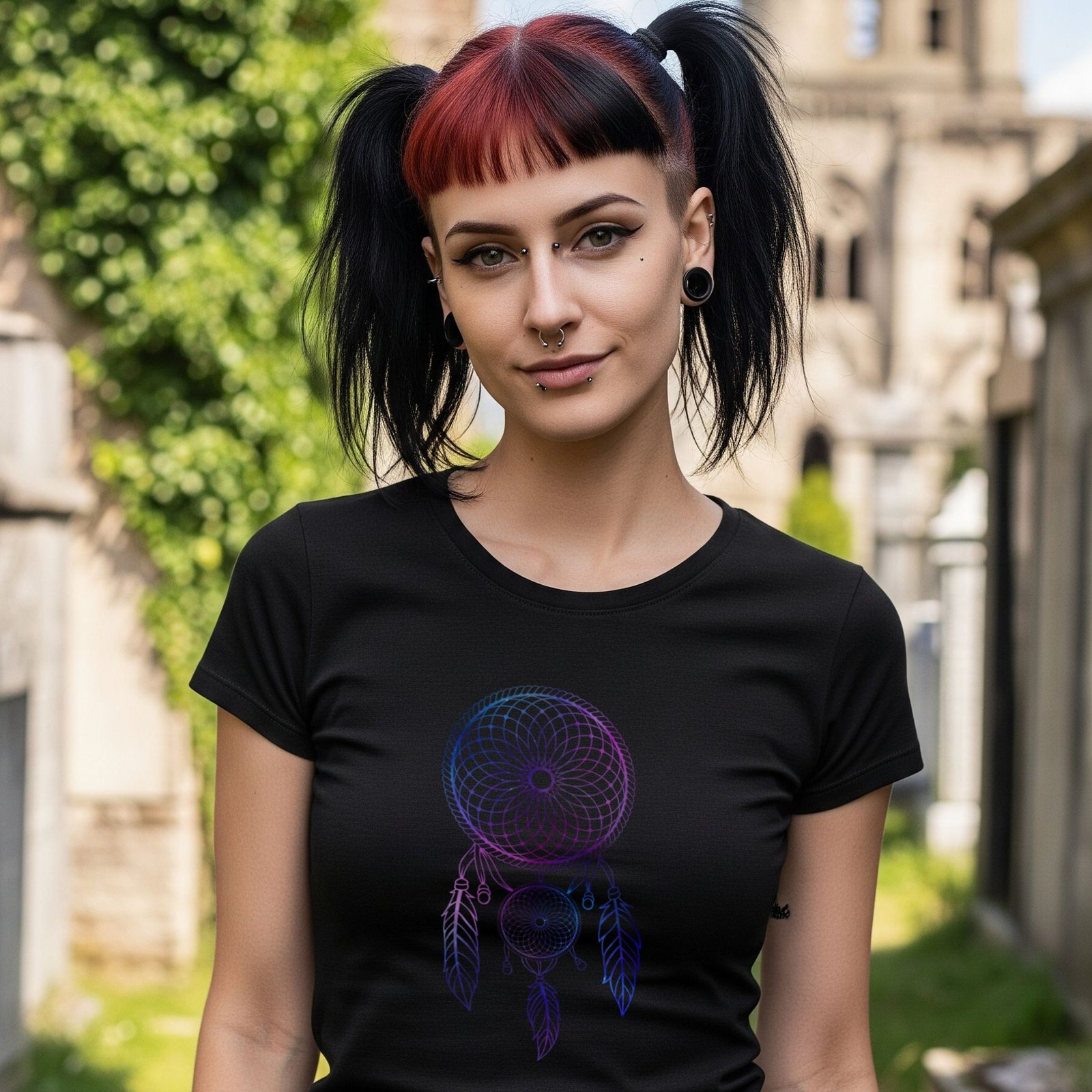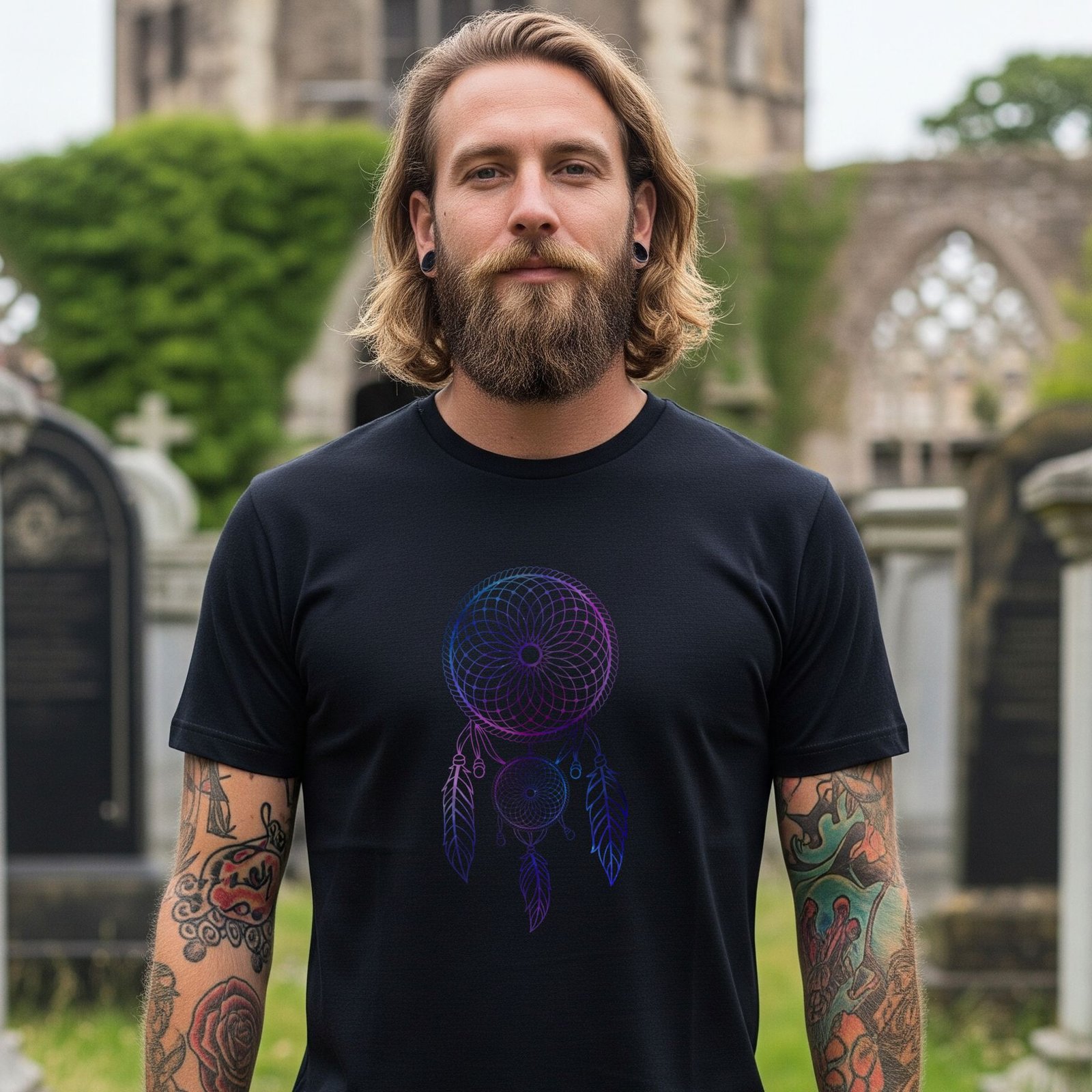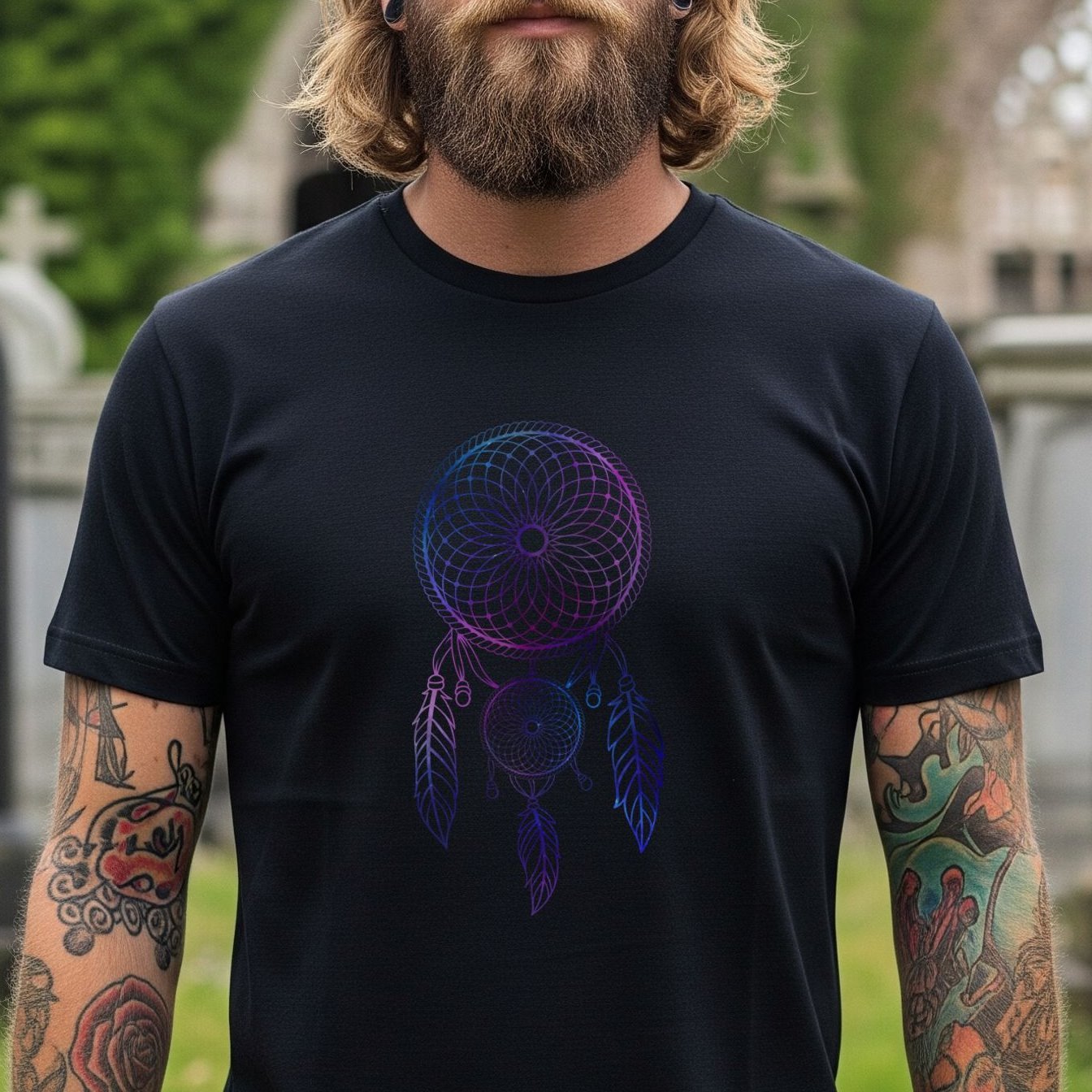Ward off bad vibes and embrace your ethereal spirit with our captivating Dreamcatcher T-shirt! This striking black tee is a modern take on a timeless spiritual symbol, designed for those who find beauty in the mystical and the macabre. The centerpiece is a beautifully detailed dreamcatcher, rendered in a mesmerizing, multi-hued gradient that shifts from deep purple to brilliant blue. The intricate web and delicate hanging feathers are a stylish and subtle nod to its traditional roots, while the sleek, contemporary color scheme gives it a uniquely modern and edgy feel.