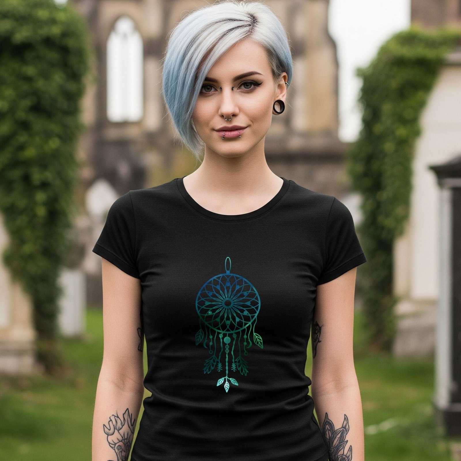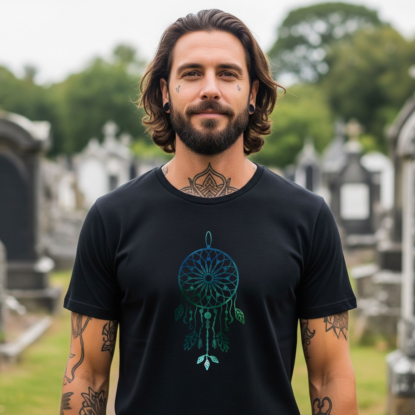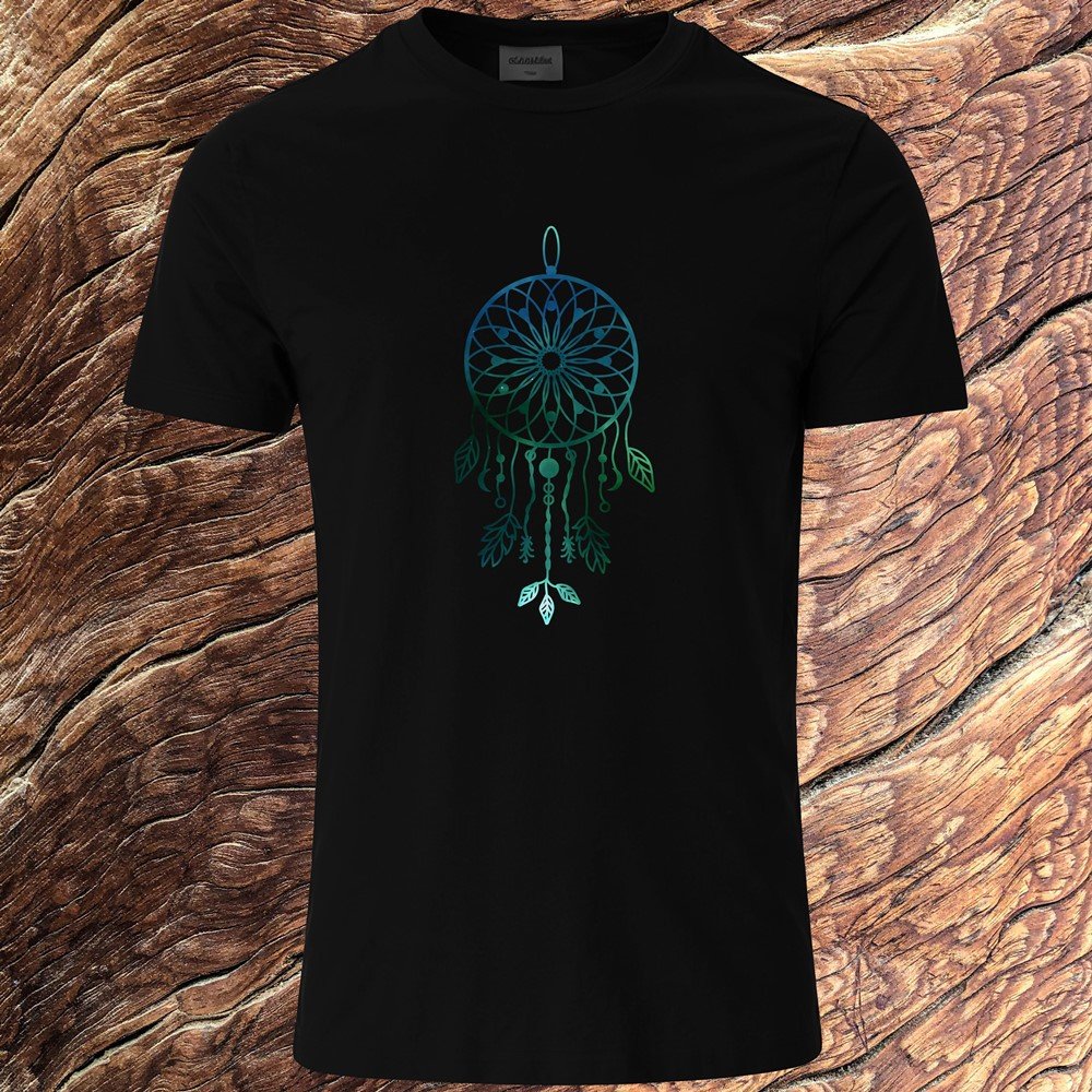 Capture your dreams and ward off bad vibes with one of our captivating Dreamcatcher T-shirts! This striking black tee is a modern take on a timeless spiritual symbol, designed for those who walk the path of the dark and the divine. The centerpiece is a beautifully detailed dreamcatcher, rendered in a mesmerizing, fading gradient of deep blue to vibrant teal. The intricate web and delicate hanging feathers are a stylish and subtle nod to its traditional roots, while the sleek, monochromatic color scheme gives it a uniquely modern and edgy feel.