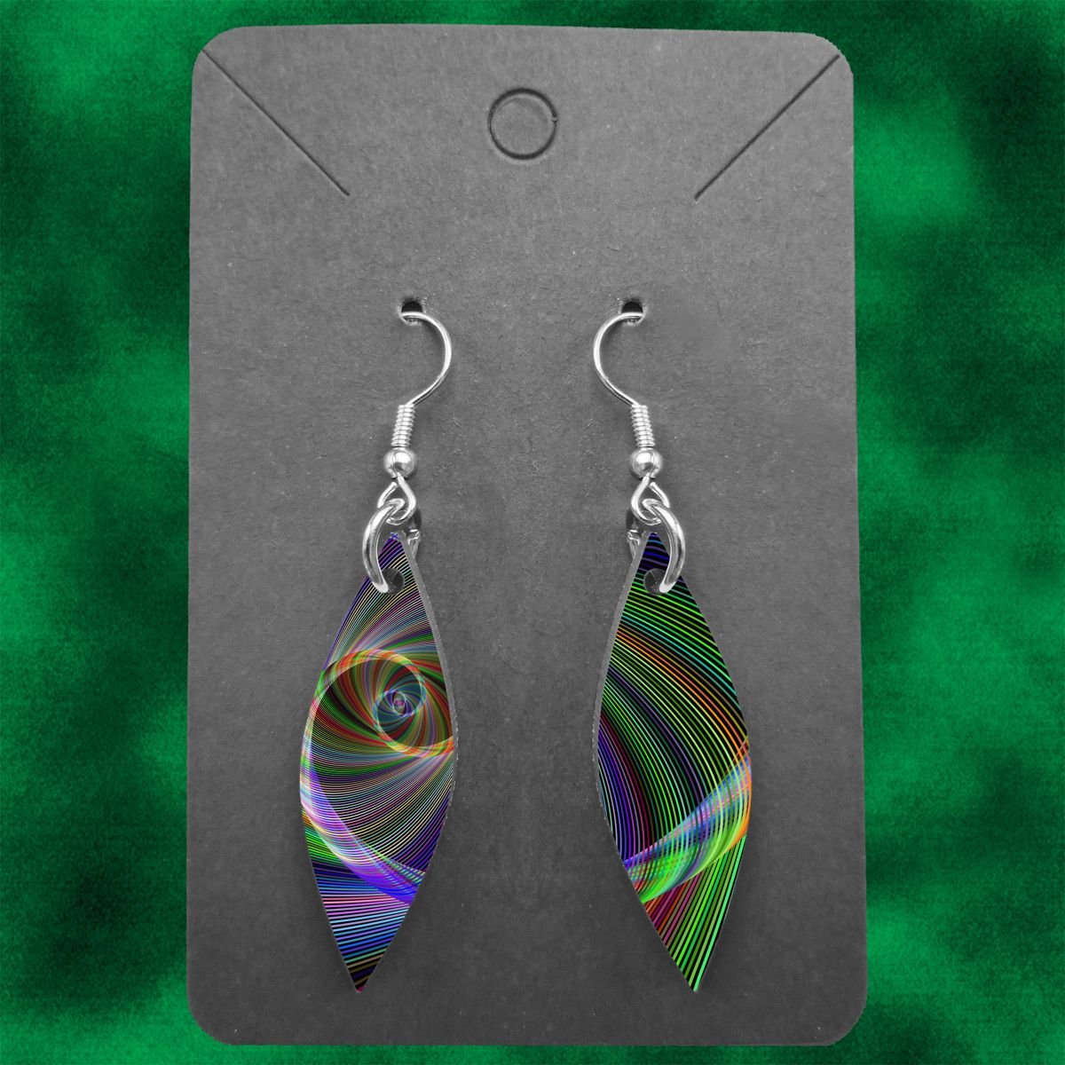 Unleash your inner magic with these captivating Rainbow Shard Fractal Earrings. Each earring features a mesmerizing, fractal design reminiscent of a cosmic vortex or an ancient, powerful sigil. The vibrant, full-spectrum colors pop against the dark lines, making these 2.5mm thick wooden shards a stunning statement piece. Choose from two unique designs.