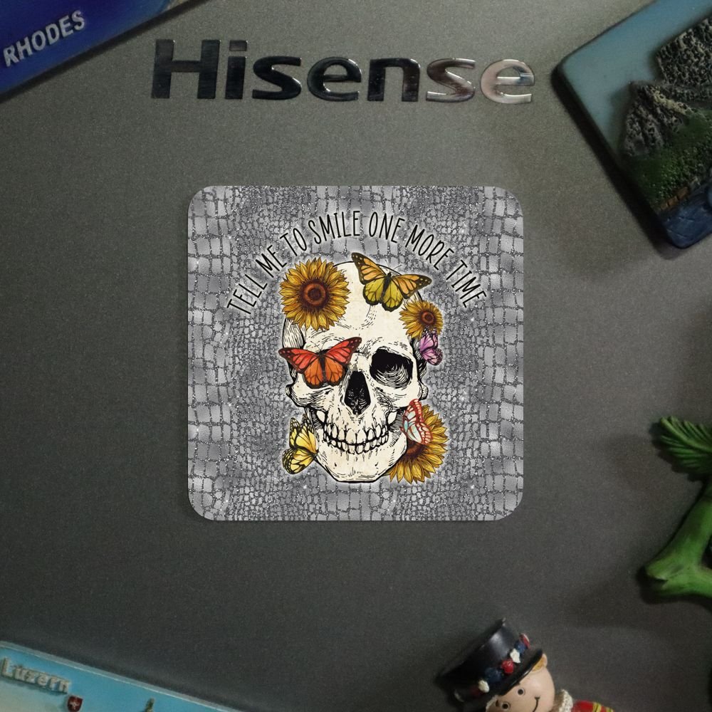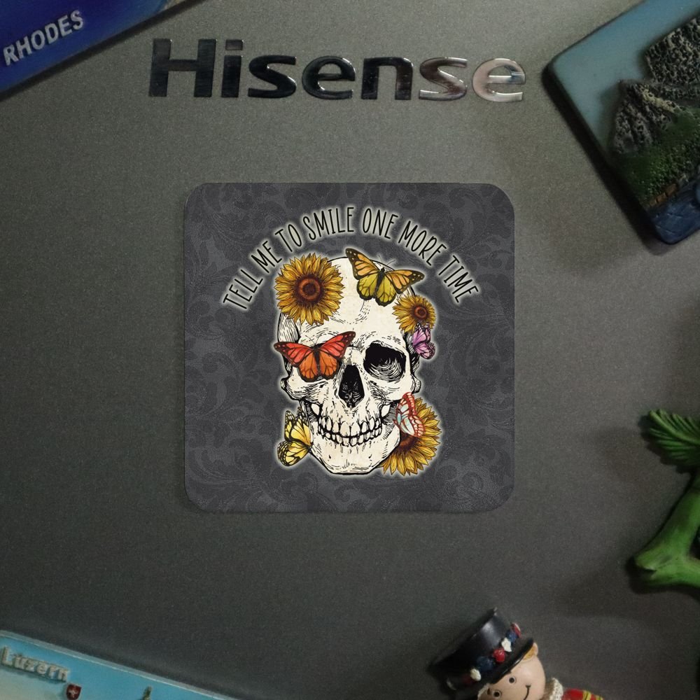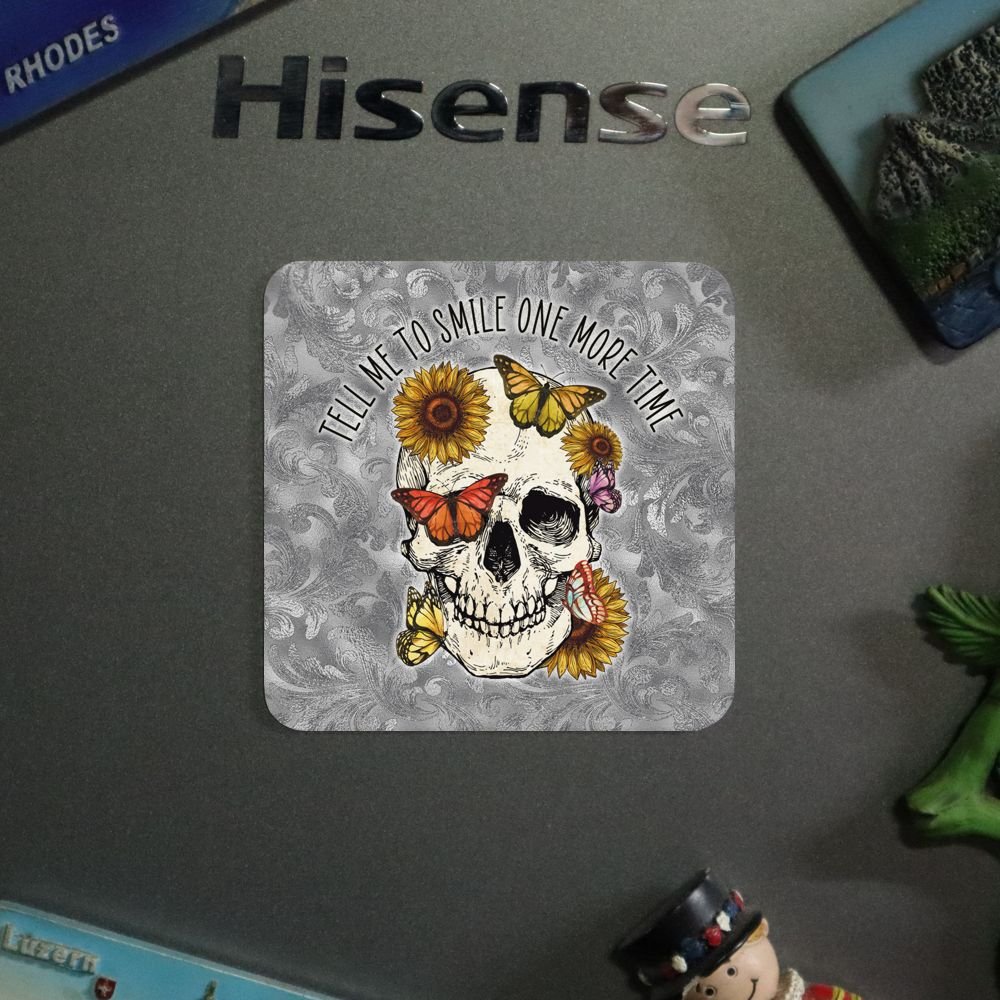 Square fridge magnet with skull and flower design “Tell Me to Smile One More Time”