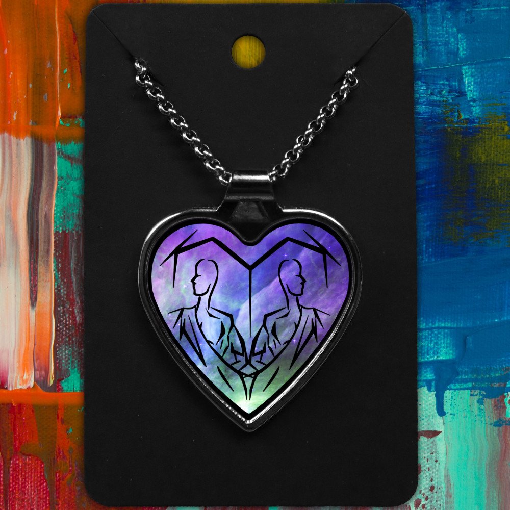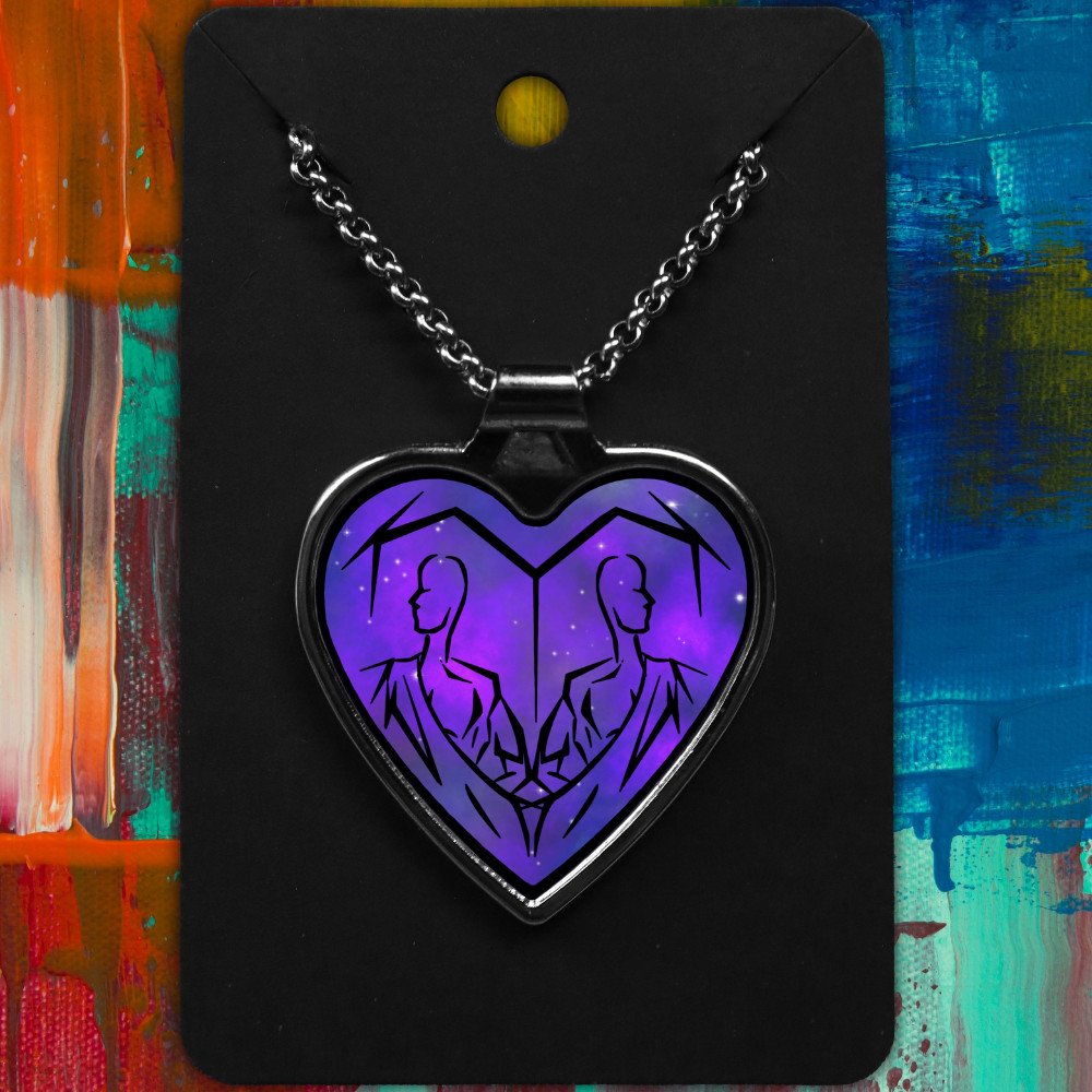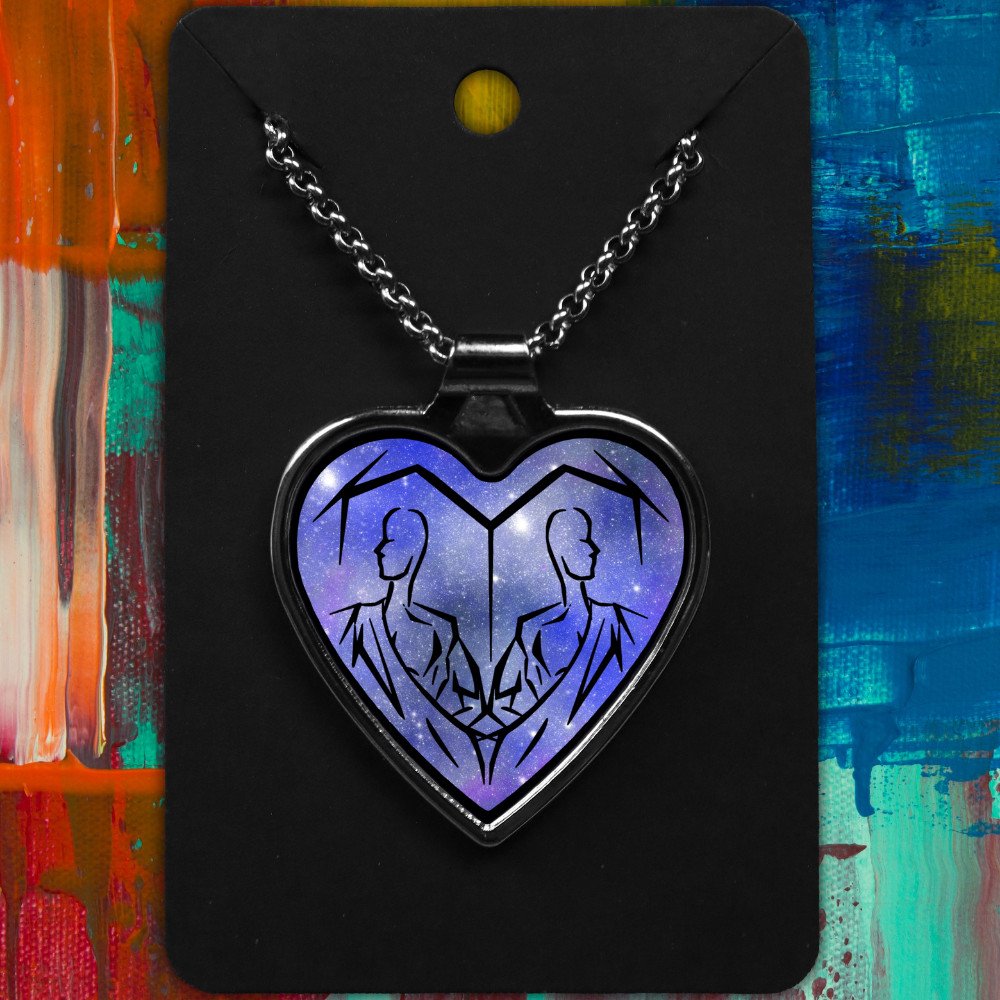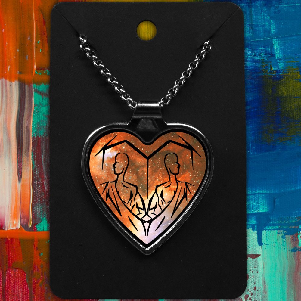 Gemini metal heart-shaped necklace with a Tribal Design on a starry background.