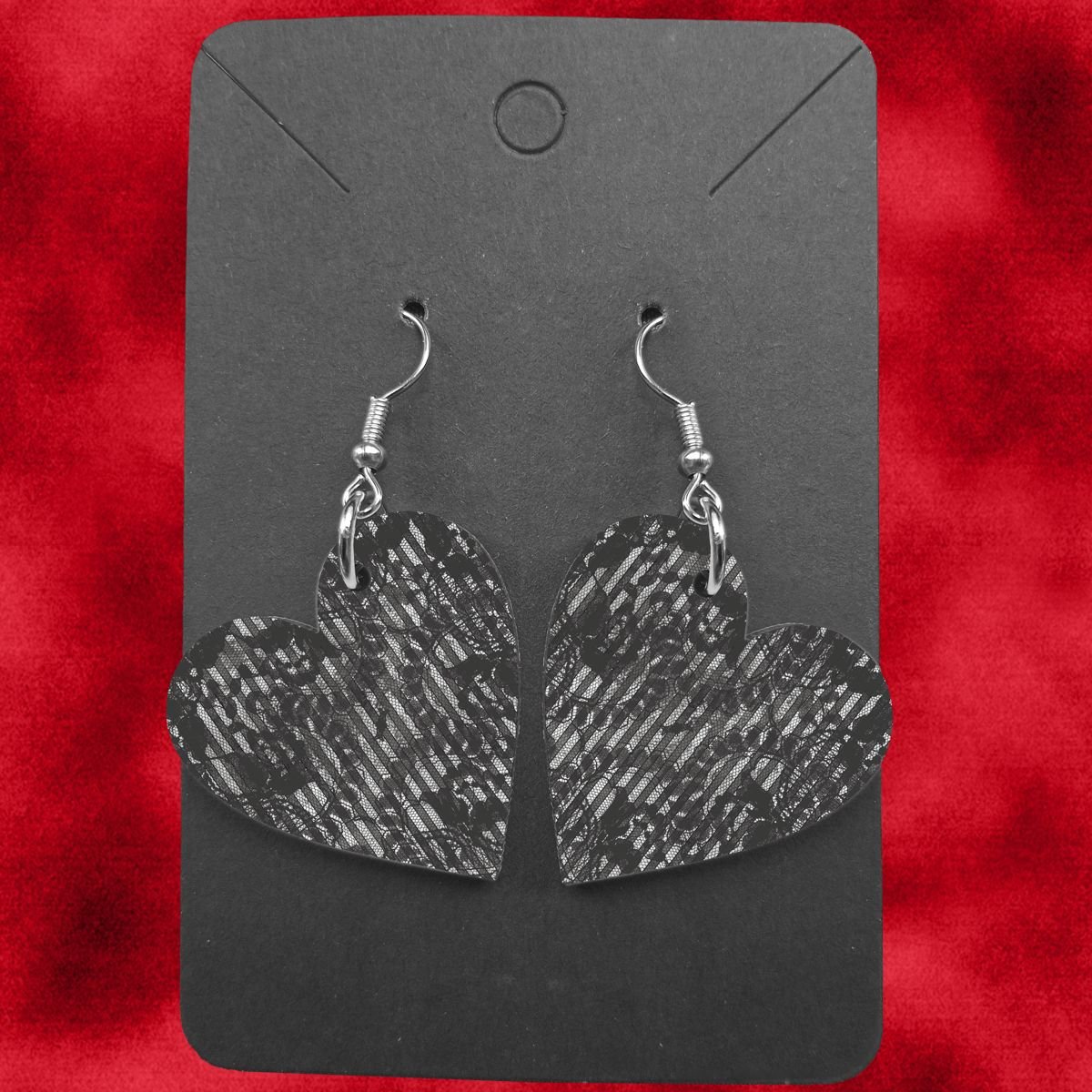 Embrace your elegant darkness with these captivating Shadow Lace Heart Drop Earrings. Lightweight yet sturdy, these hearts are crafted from 2.5mm thick wood and feature classic metal attachments, making them comfortable for all-day wear.