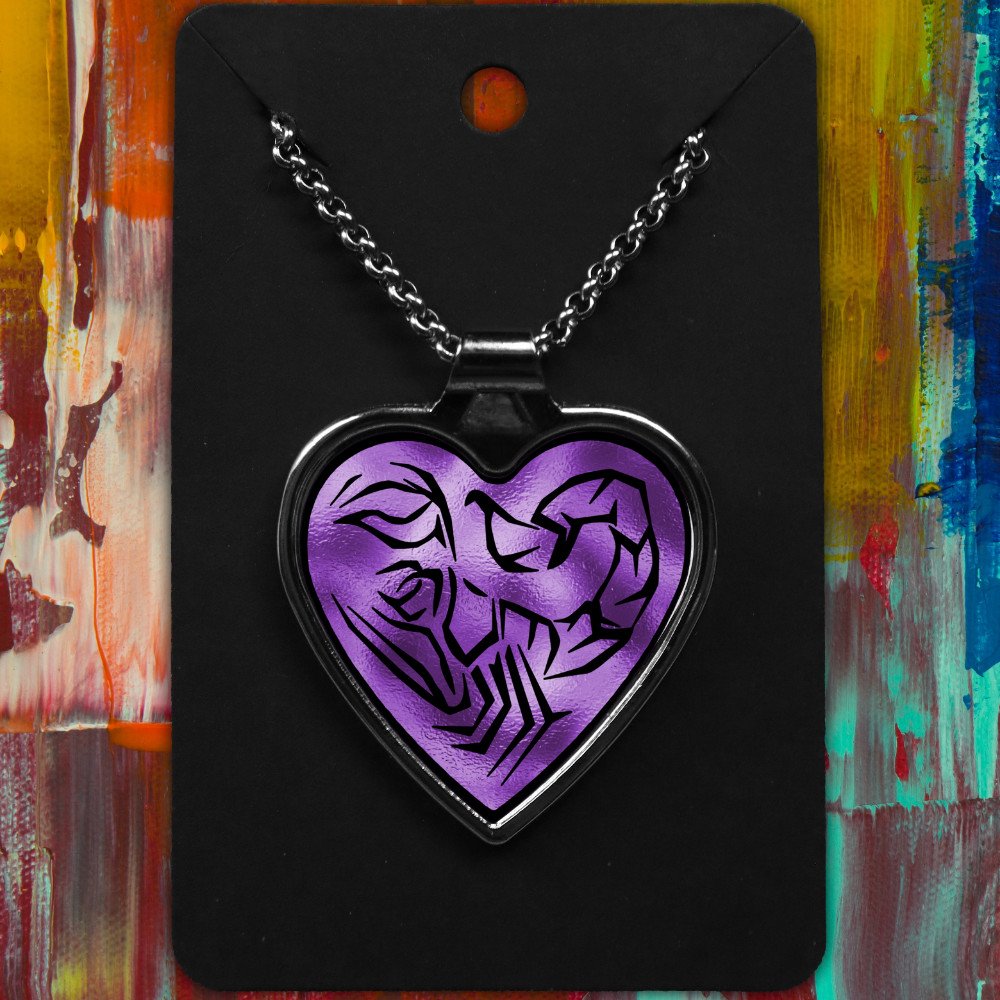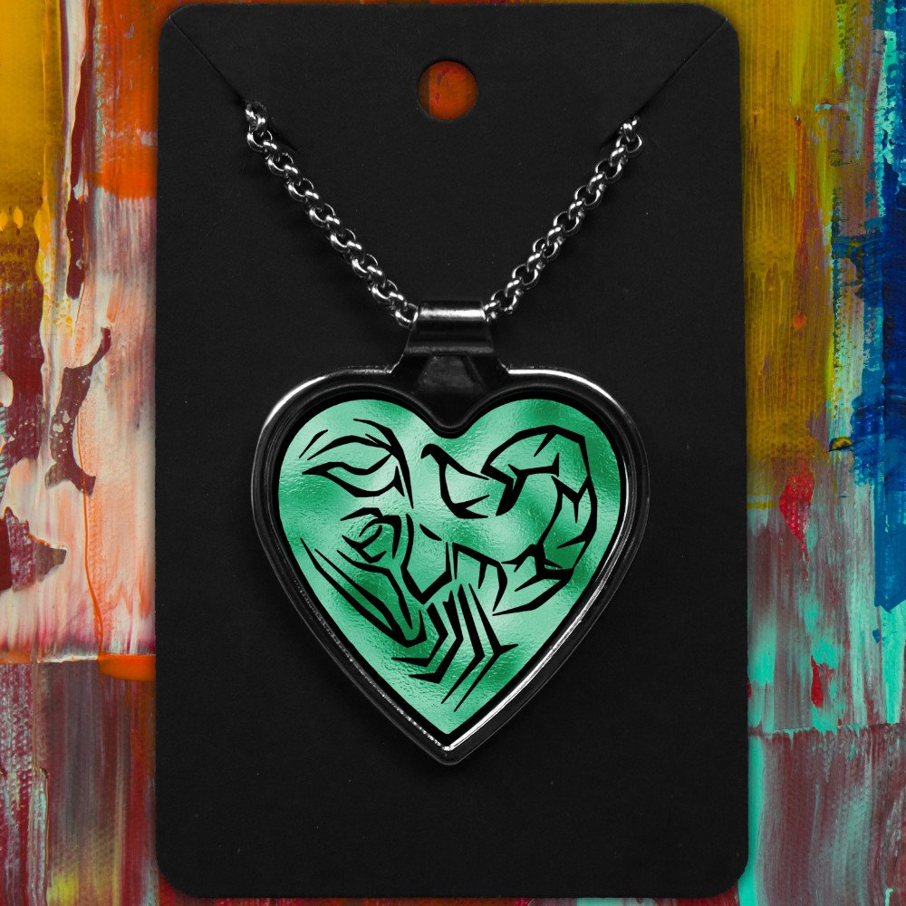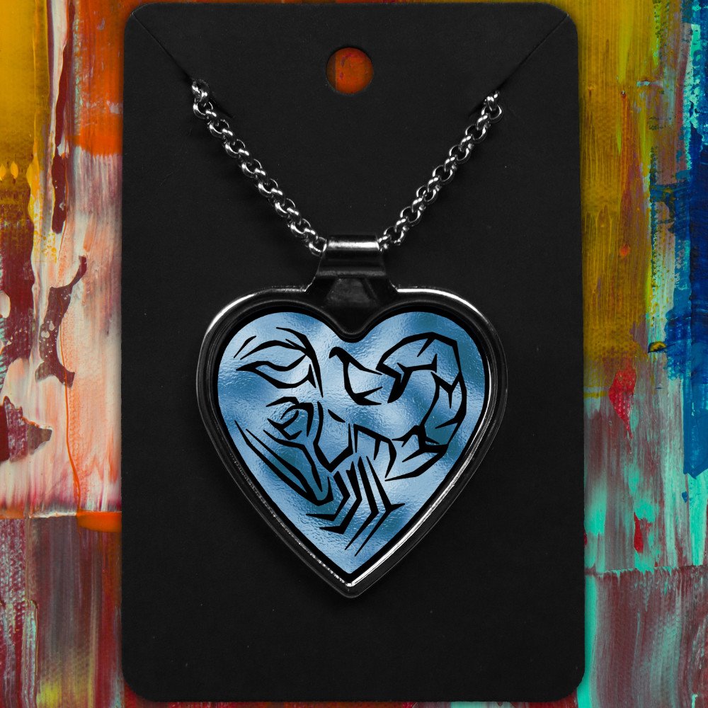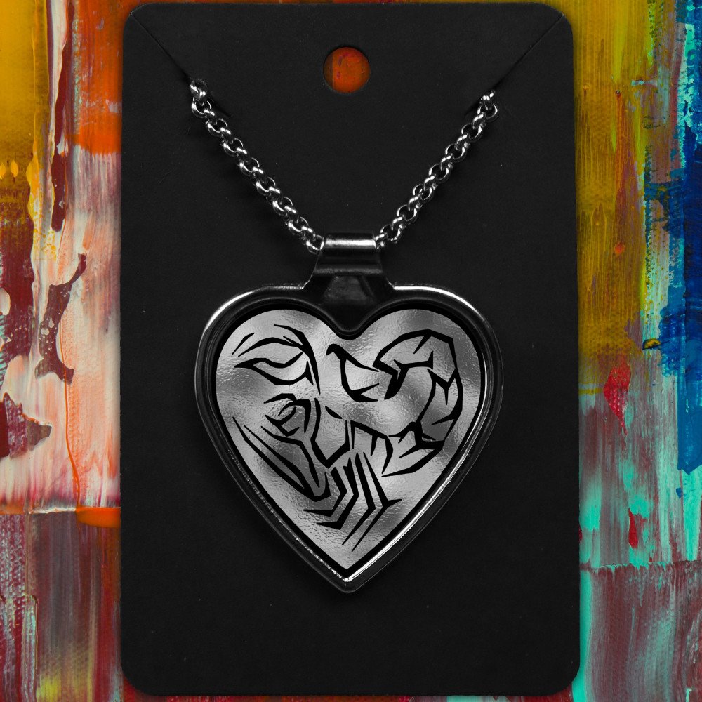 Scorpio metal heart-shaped necklace with a Tribal Design on a shimmering background.