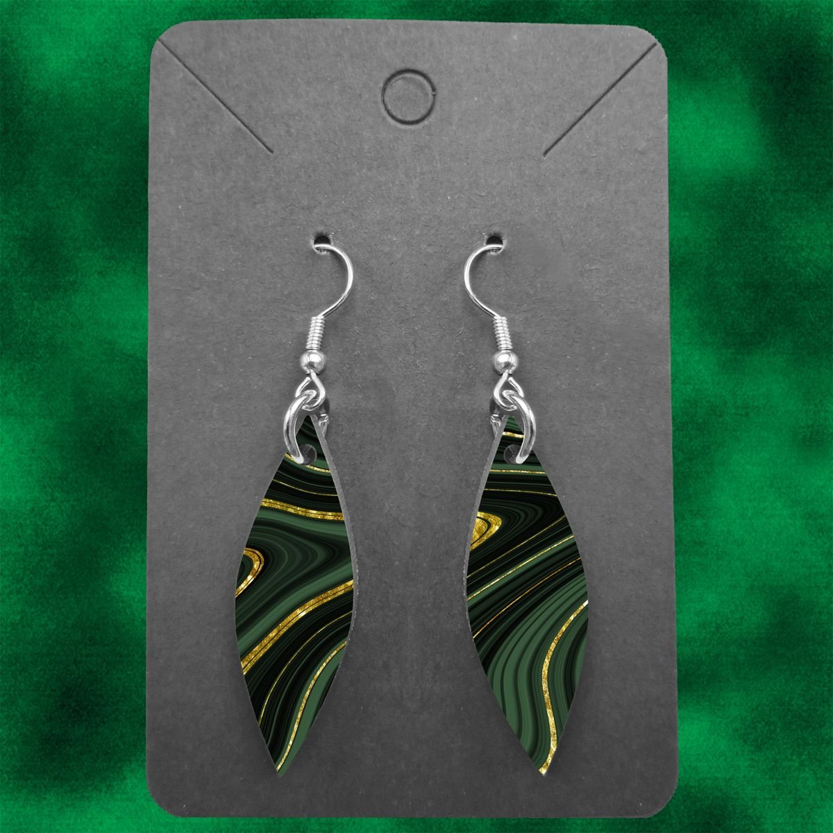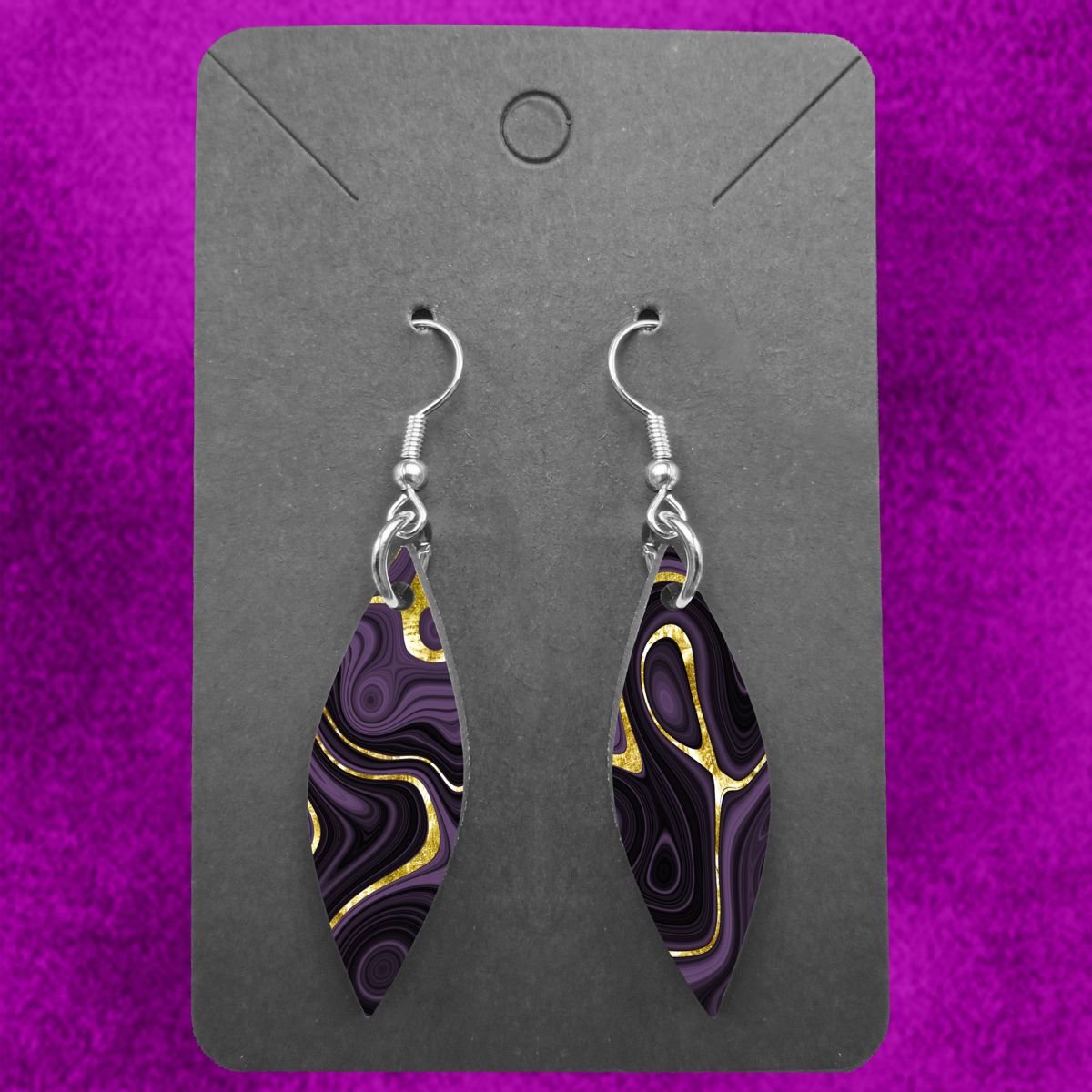 Tap into the earth’s deep, mystical energy with these striking Geode Shard Earrings. The geode-inspired design features rich layers of either deep forest green or mystical purple and midnight black swirling around veins of shimmering gold. It’s a powerful look that evokes hidden treasures.