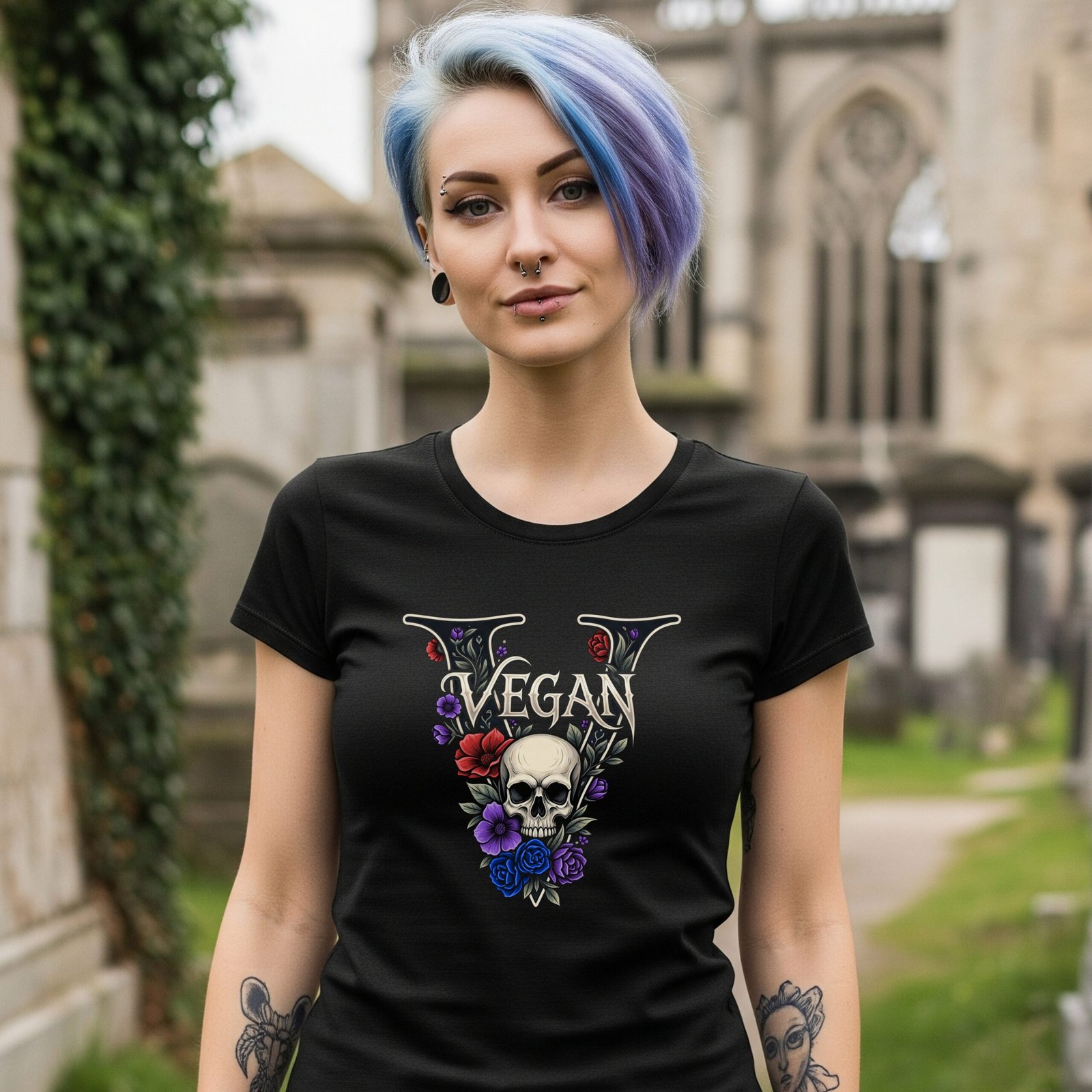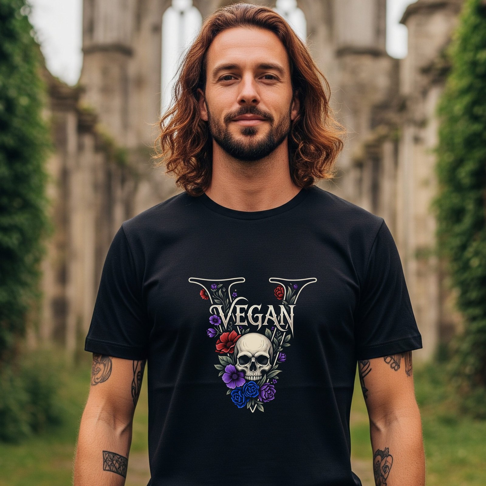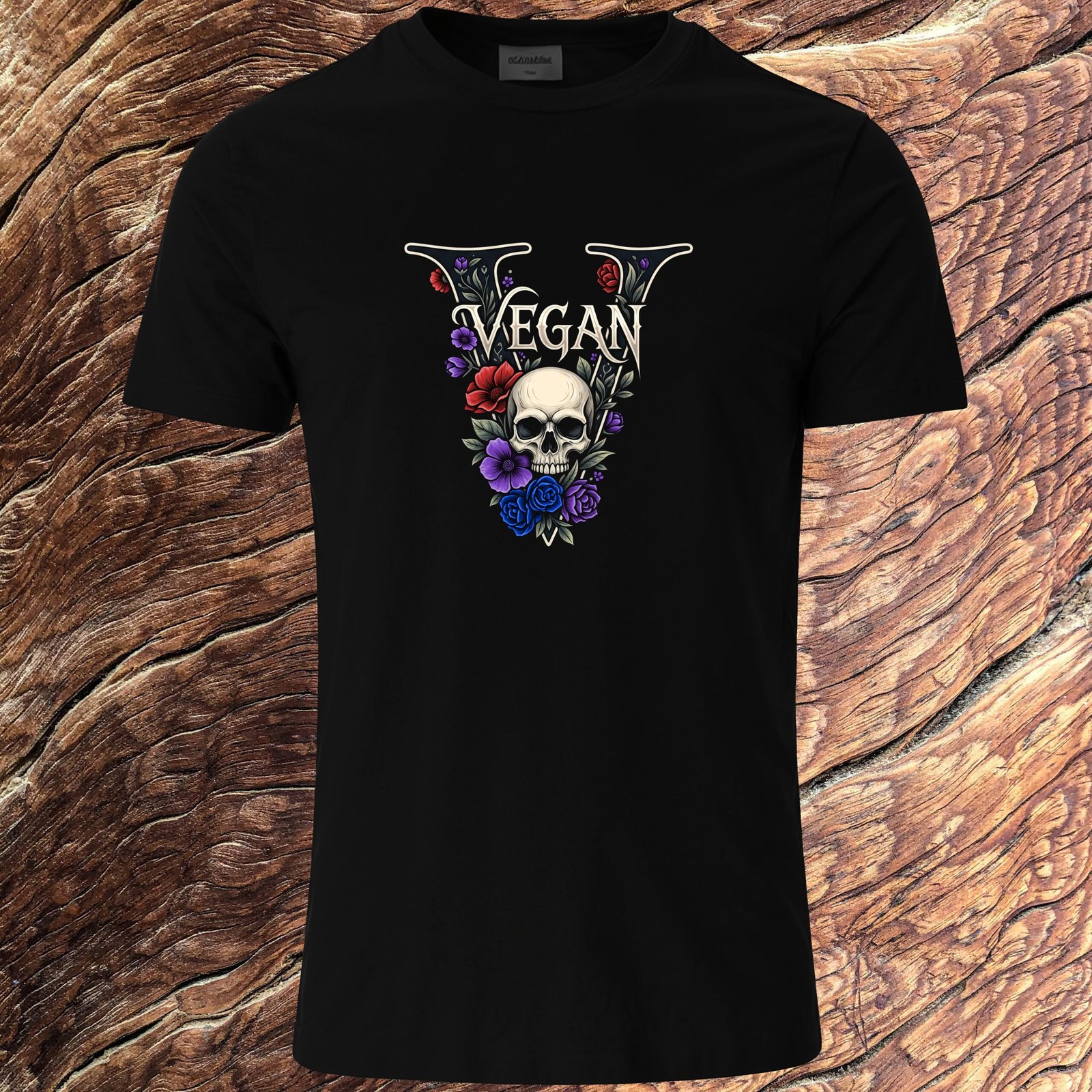 Embrace your compassionate convictions with a touch of dark elegance in our Gothic Vegan T-Shirt! This unique design merges your ethical lifestyle with an edgy, artistic aesthetic. The striking graphic features a stylized “V” for Vegan, intricately woven with a captivating skull and adorned with a vibrant bouquet of deep red, rich purple, and cool blue roses. It’s a powerful visual statement that celebrates both life and a commitment to plant-based living, challenging conventional perceptions of what it means to be vegan.