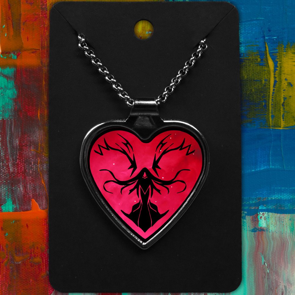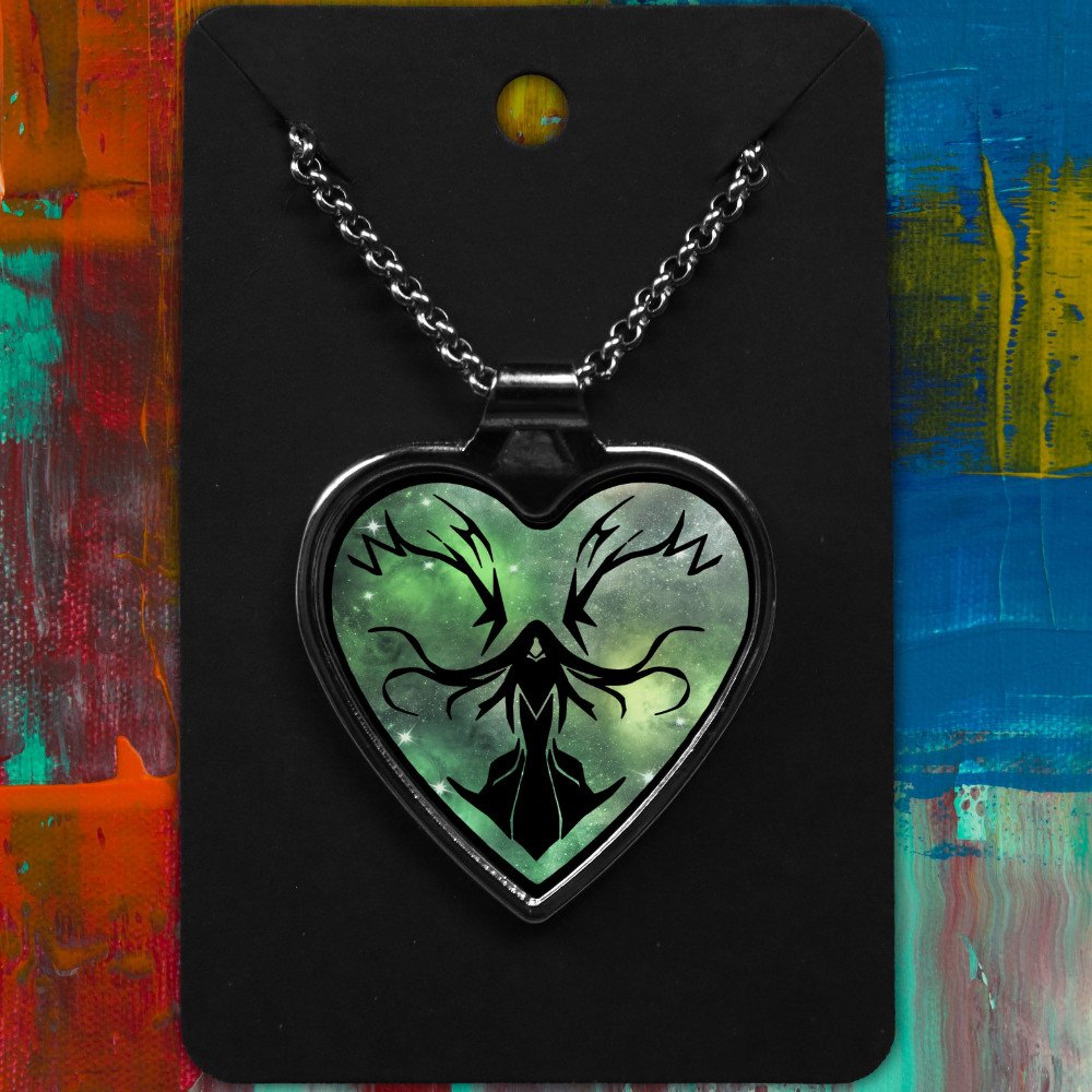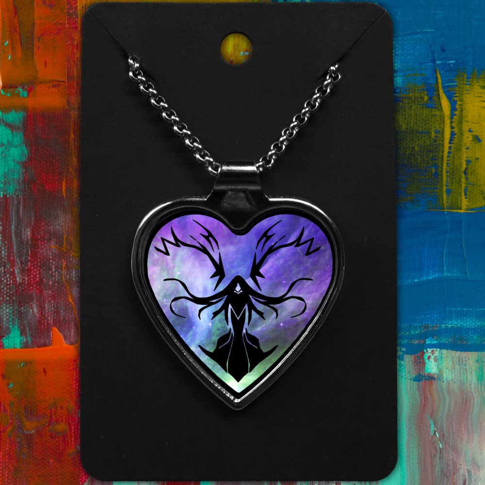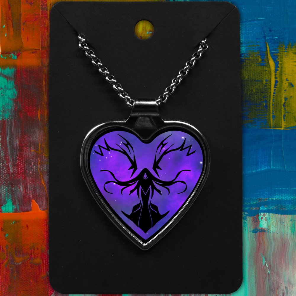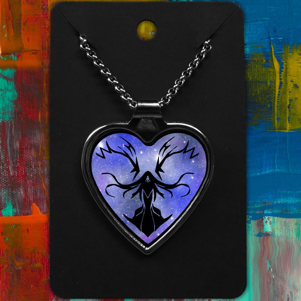 Virgo metal heart-shaped necklace with a Tribal Design on a starry background.