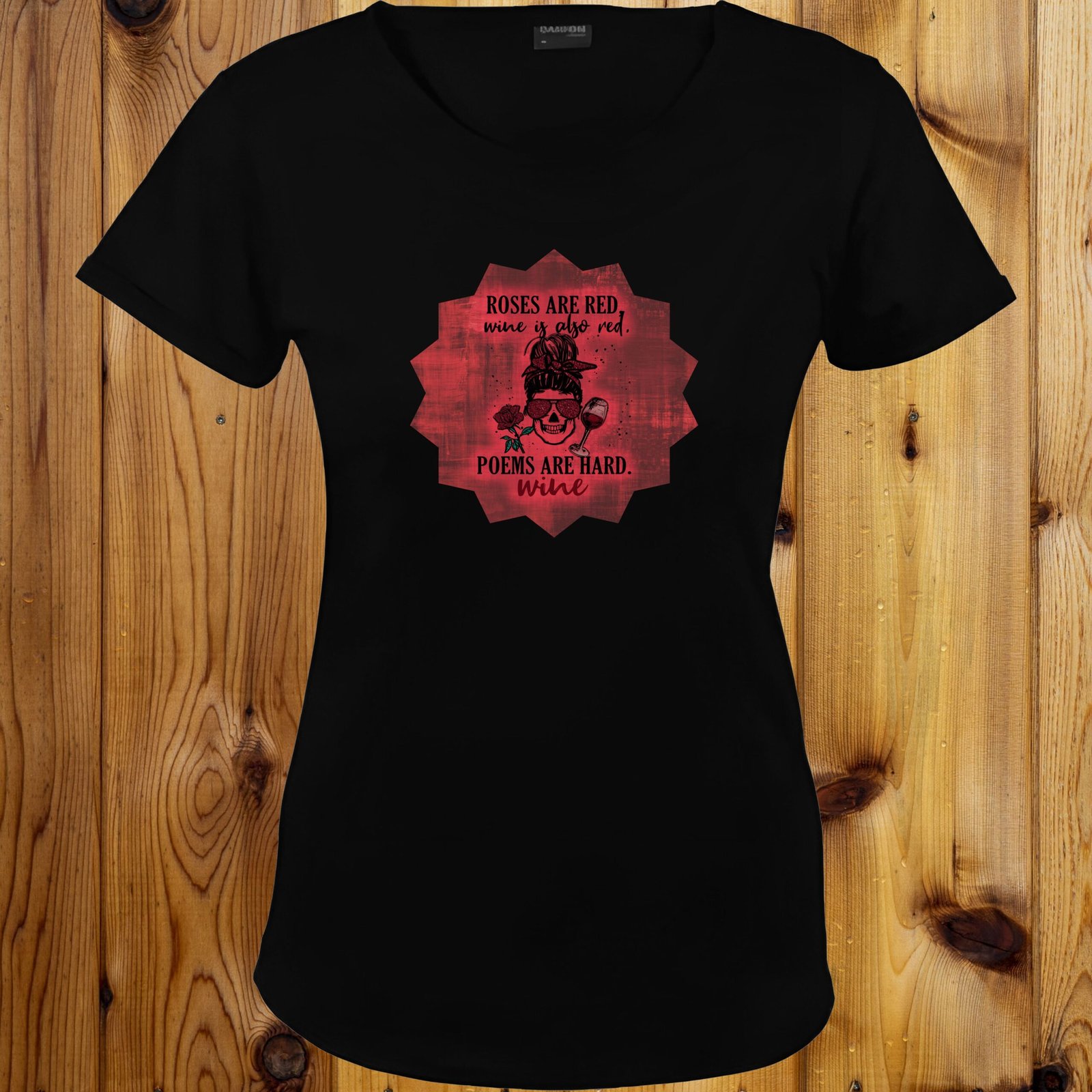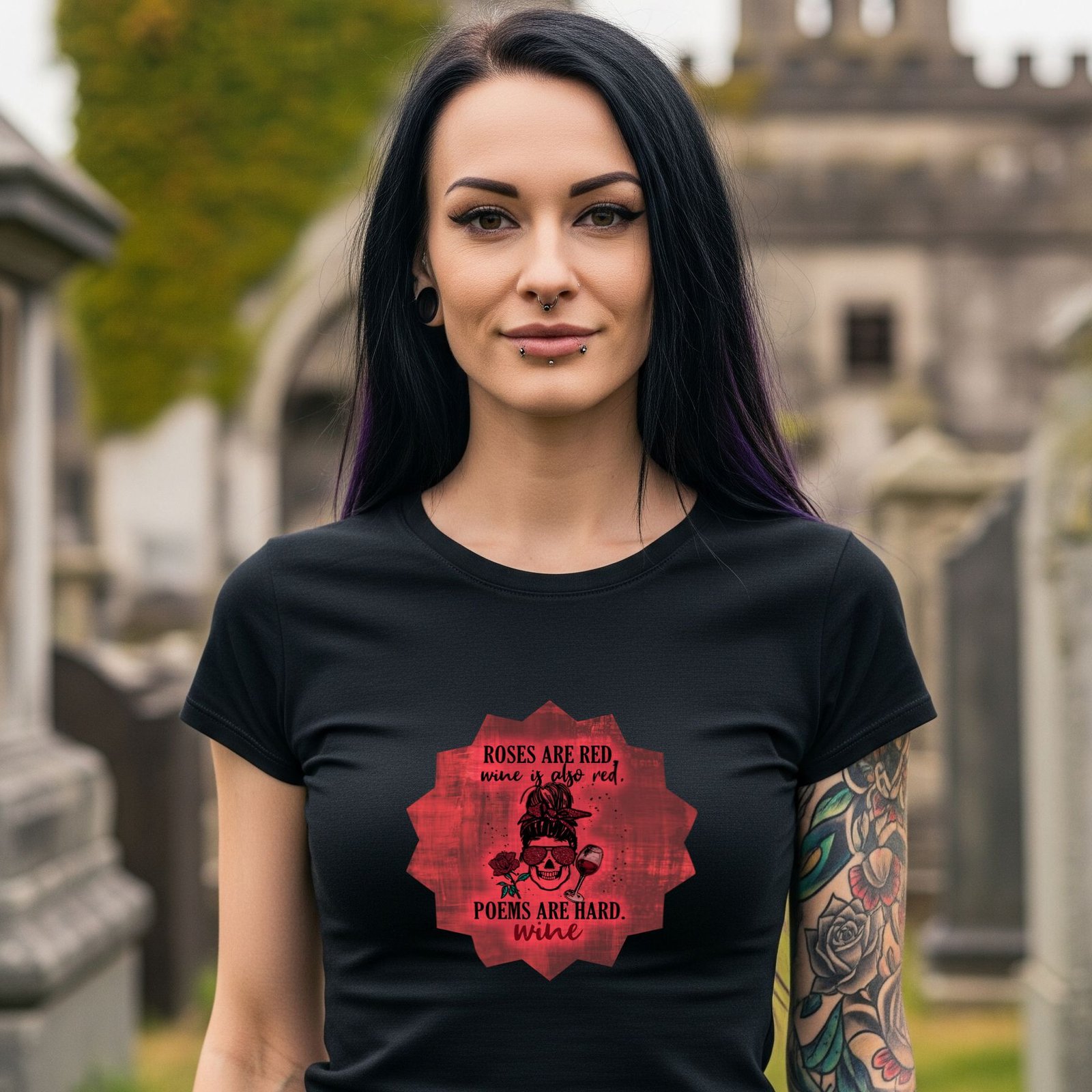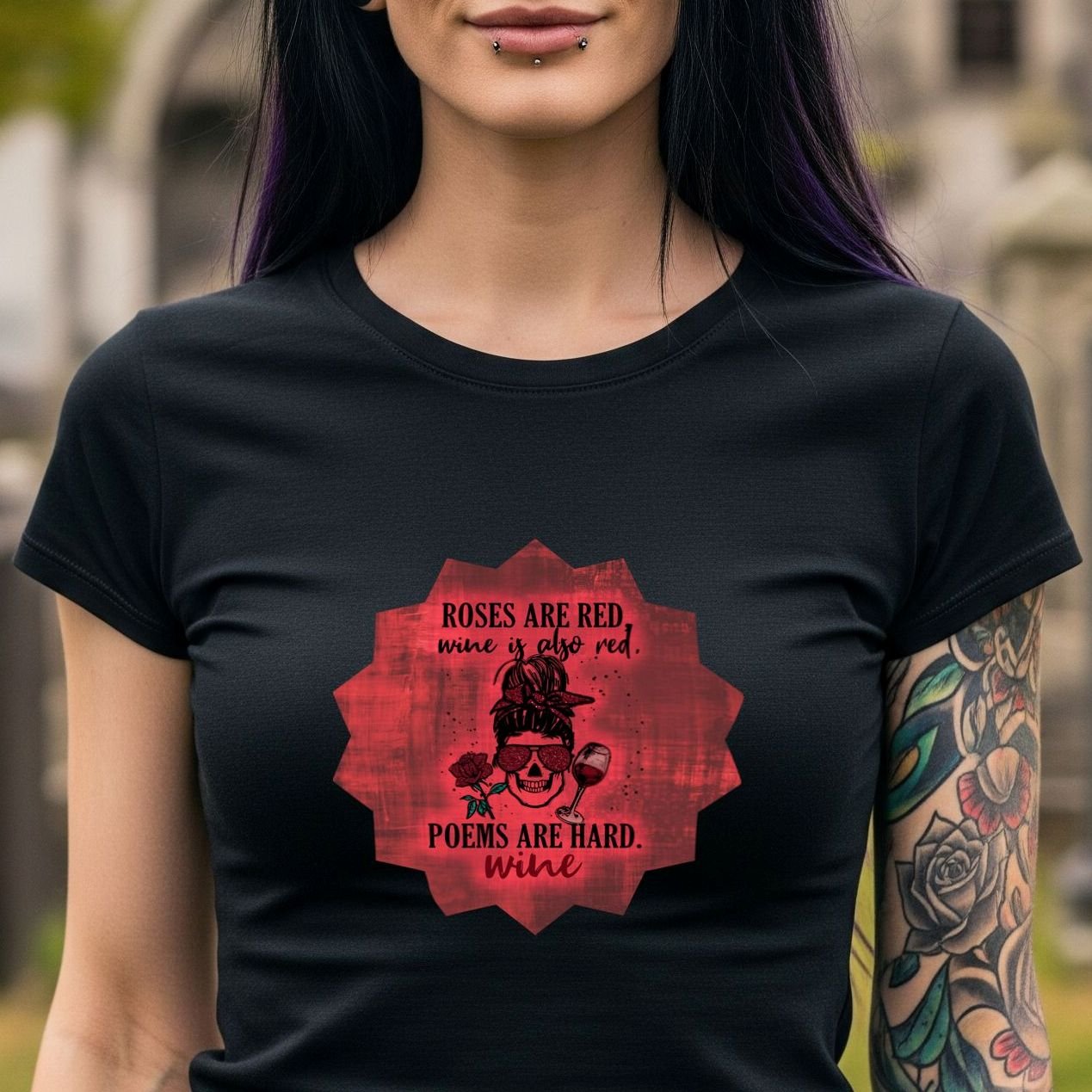 The quirky, bad-poetry text “Roses are red, wine is also red. Poems are hard. Wine.” adds a sarcastic and relatable twist that will surely resonate with your alternative spirit. It’s a witty and refreshing take on a classic theme, blending elements of romance, humor, and gothic aesthetics.